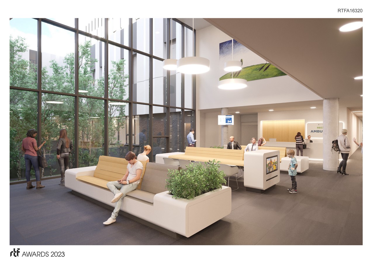 Located in front of the hospital is a spacious forecourt. The inviting main entrance opens onto the central boulevard, which forms the main route through the hospital for patients on their way to the policlinics and the lifts to the nursing units. The boulevard is a pleasant and spacious footbridge with views of the patio gardens on both sides. Visitors and patients can therefore find their way around easily and reach their destination with less stress.