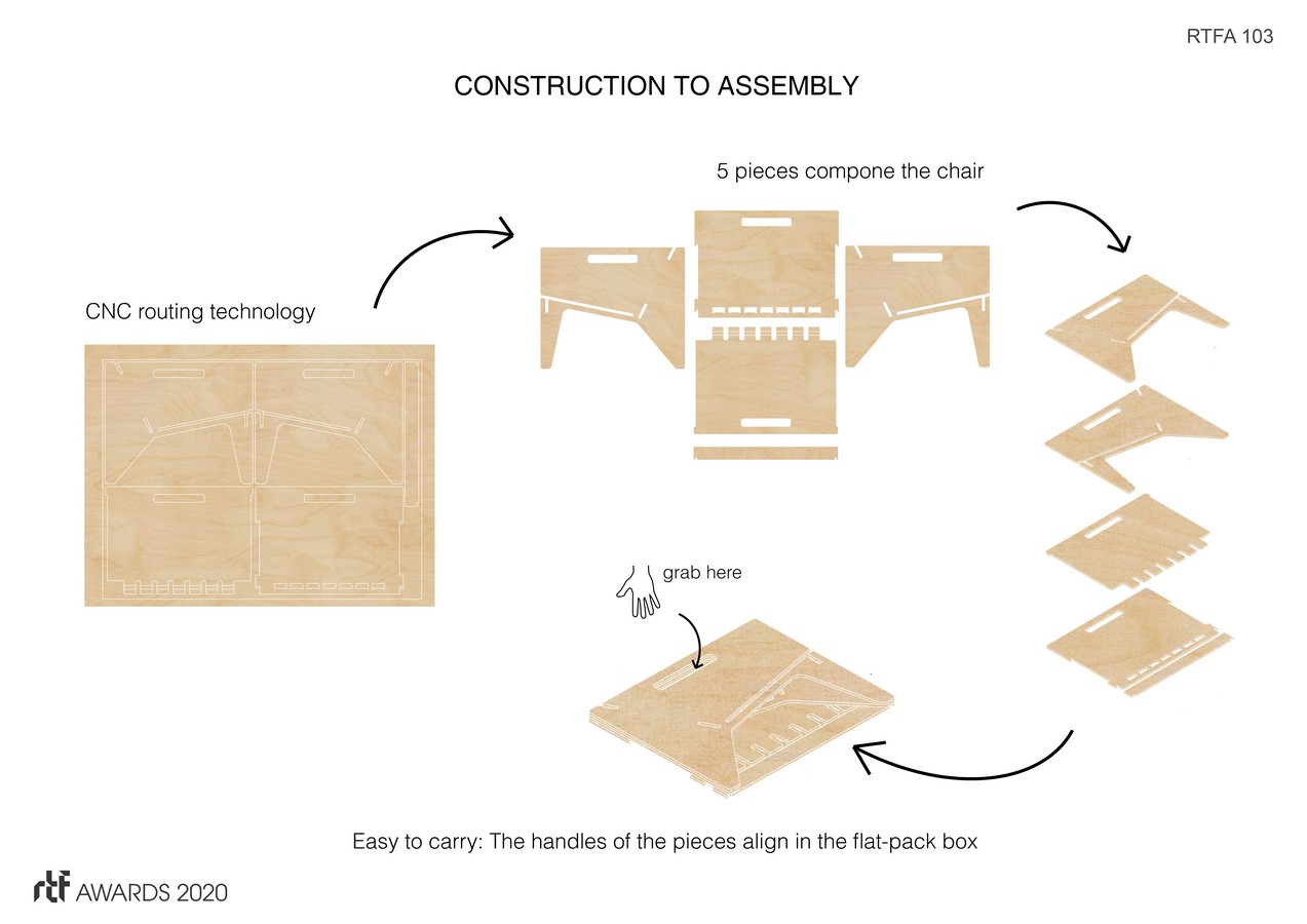 Nomad Chair 2019 is part of a new collection of flat-pack ply-wood furniture. Each chair is made of five robust components that simply slot together – no glue, no screws and no tools required. Assembling and disassembling is easy and only takes minutes.