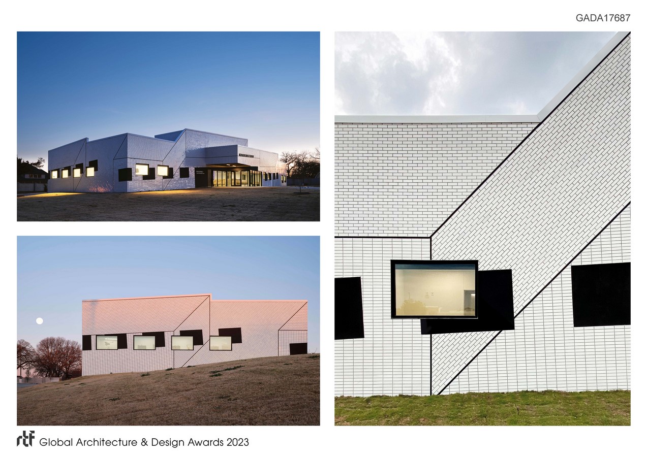 The facades, considered merely as a form of orthographic representation, are black and white oblique drawings of the buildings themselves, using control joints as lines, the brick-veneer walls as surfaces, and the “shadow” EIFS areas as openings or cut-outs. The thin brick system, used with varied stacked and running bond patterns in horizontal and diagonal arrangements, conform to the drawn projections on the facades, while exposing the symbolic quality of the material as a non-brick—a tiling system that only signifies brick. In this way, the exterior facades function as two-dimensional surfaces wrapped around building shells that attempt to represent, but never fully correspond to, the logic of the interior. In doing so, the project aims to reveal the disjunction between the interior and the exterior, the structure and the skin.