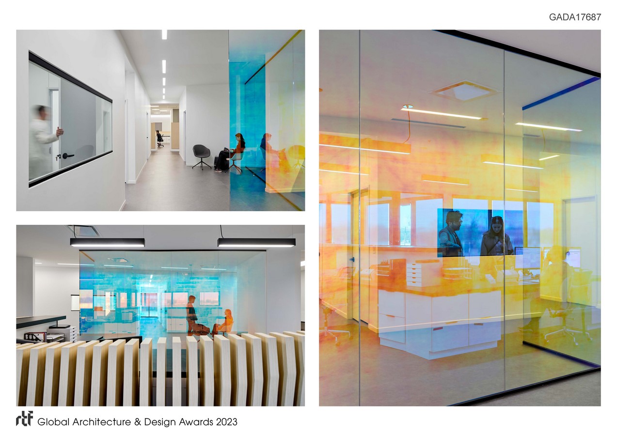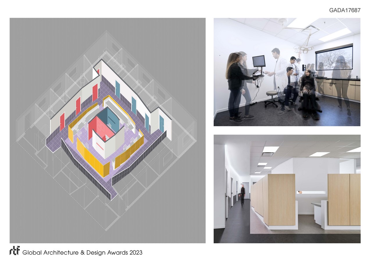 The floor plan was developed through a series of agent-based computer simulations (using Pedestrian Dynamics and AnyLogic software) in order to synchronize the circulation with the schedule and pattern of activities, maximize efficiency and minimize unwanted obstructions or interactions. The interior finishes and flooring mark and distinguish the public (patients) spaces from the private (staff) areas, at times exposing the mismatch between the original diagram and the final layout.