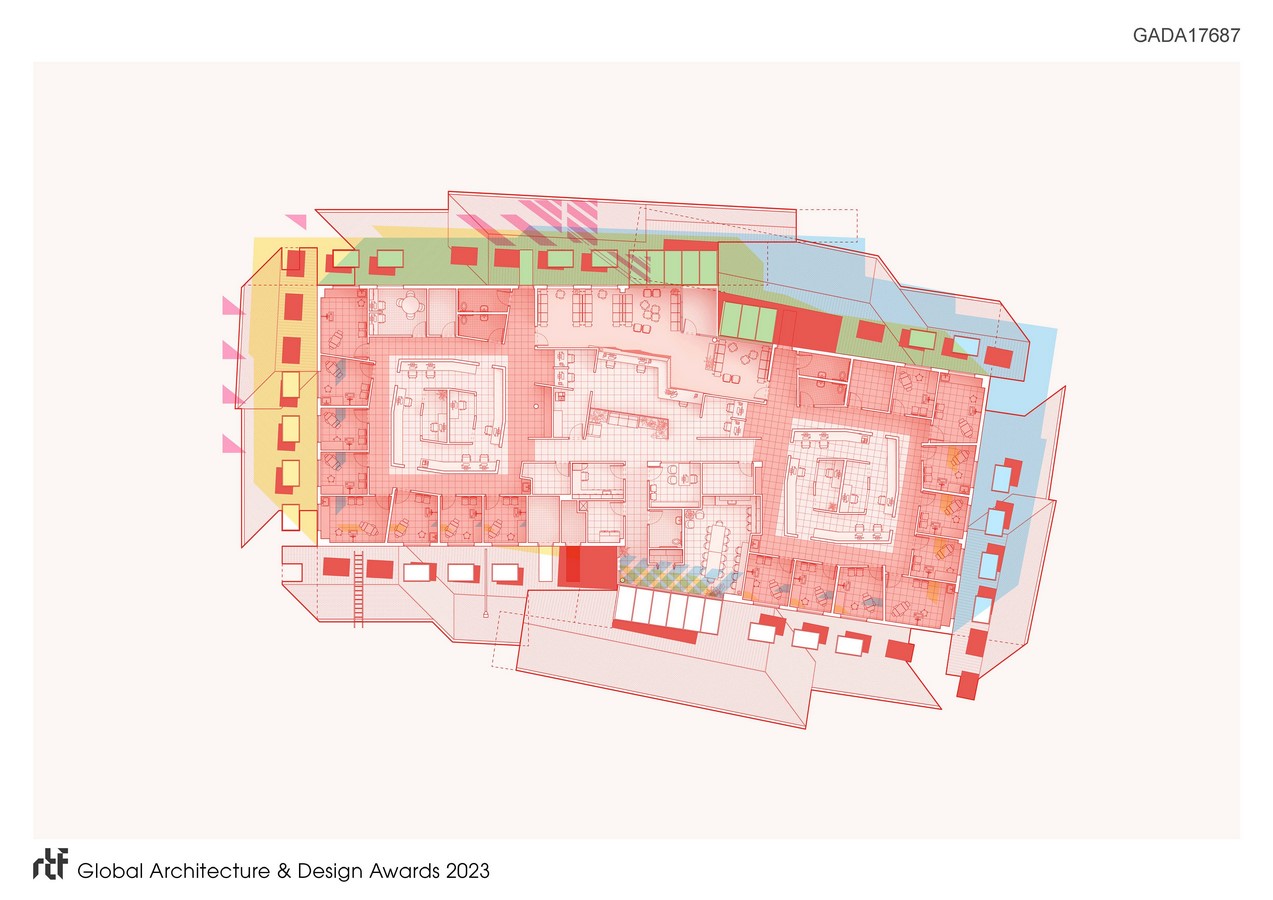 The clinical zones each have an embedded rotation that distort their original square plan and create an alignment between the other clinical zone. This subtle rotation also transforms the square volumes of the interior into irregular octagonal ones that in turn facilitate circulation and communication around the nurse stations. The rotation is carried out not just within each building, but also between the three buildings on campus, creating an interplay between the building volumes forming a pinwheel around the central plaza. The central staff and administrative spaces occupy the shared area that connects the two clinical zones on either side of the clinic. Within the clinical zones, spaces are further divided in concentric arrangements, defining the circulation patterns and a system of visual communication and surveillance between doctors, nurses and patients: the doctors’ offices at the very center overlooking the nurse stations, and the nurse stations facing the patient examination rooms on the peripheries.