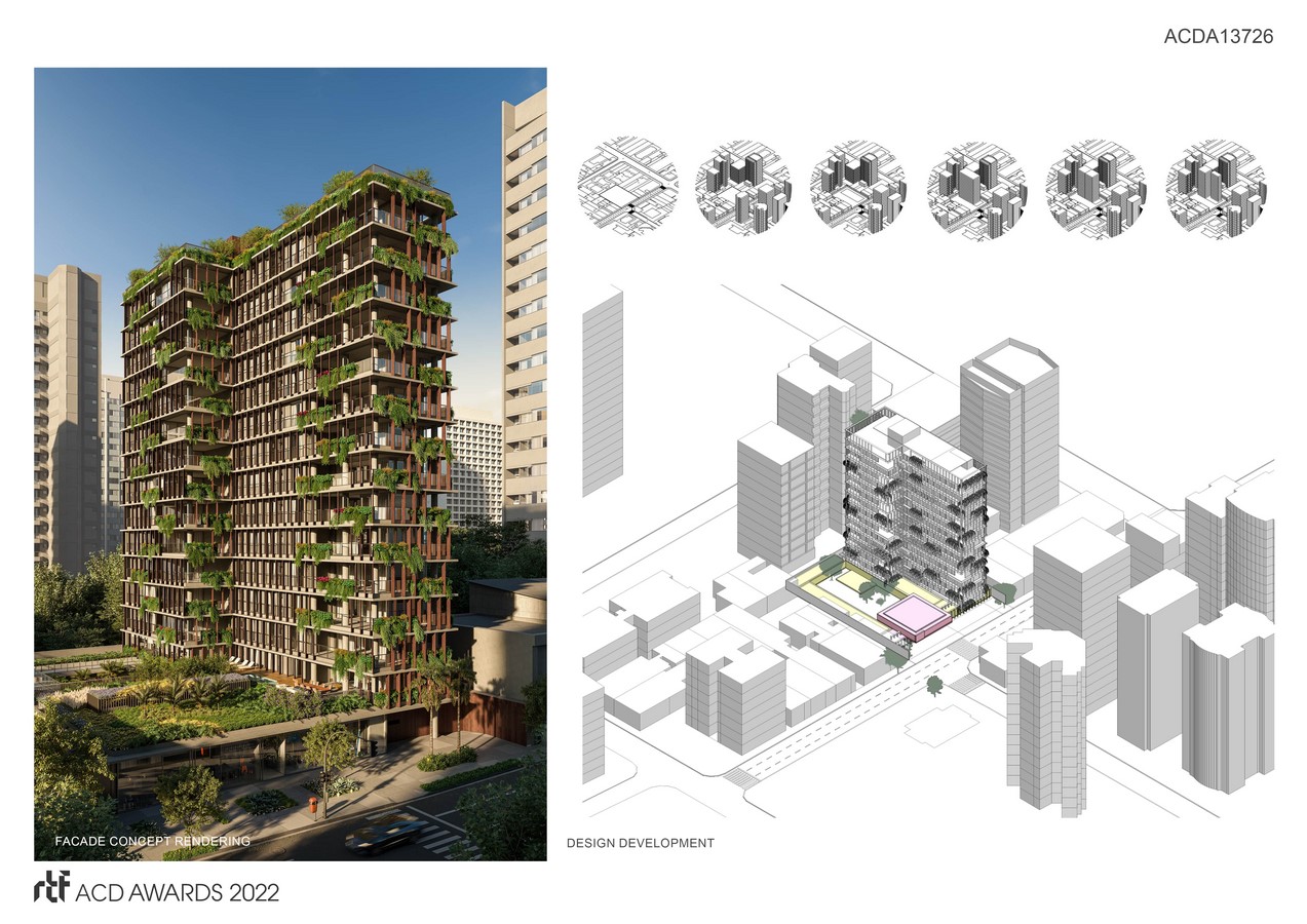 This building’s main features are its sustainability and the dialogue it creates with the public space in the surroundings, whilst guaranteeing privacy and comfort for its residents. It is composed of one residential tower, a commercial ground floor and a suspended green plaza. The project was developed entirely in BIM technology, which facilitated the interfaces between the programs and the compatibility of structural projects.