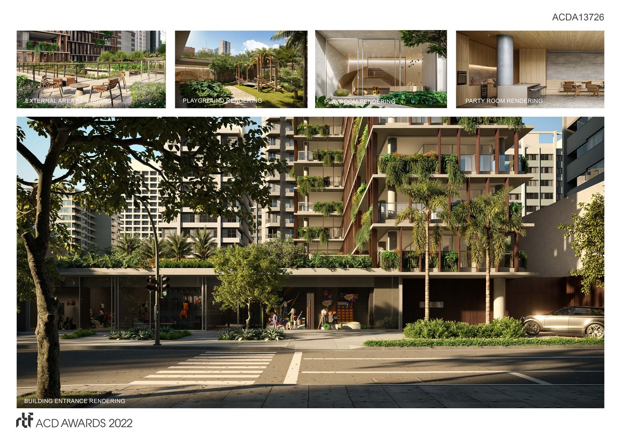 The building’s design was conceived to have a pleasant relationship with the pedestrian’s point of view. The residential tower is recoiled from the front of the construction, giving space to the suspended green square on the first floor, full of lush vegetation composed by native species. This space creates an unbuilt green lung of more than 40m along the entire main street, maintaining a fluid perception between the surrounding buildings and preserving the views of the residential tower and the street.