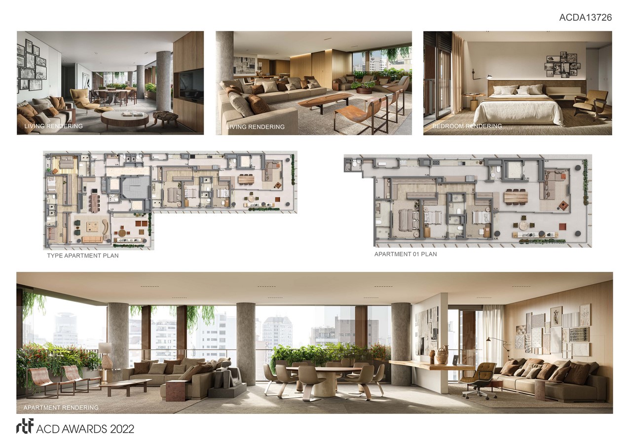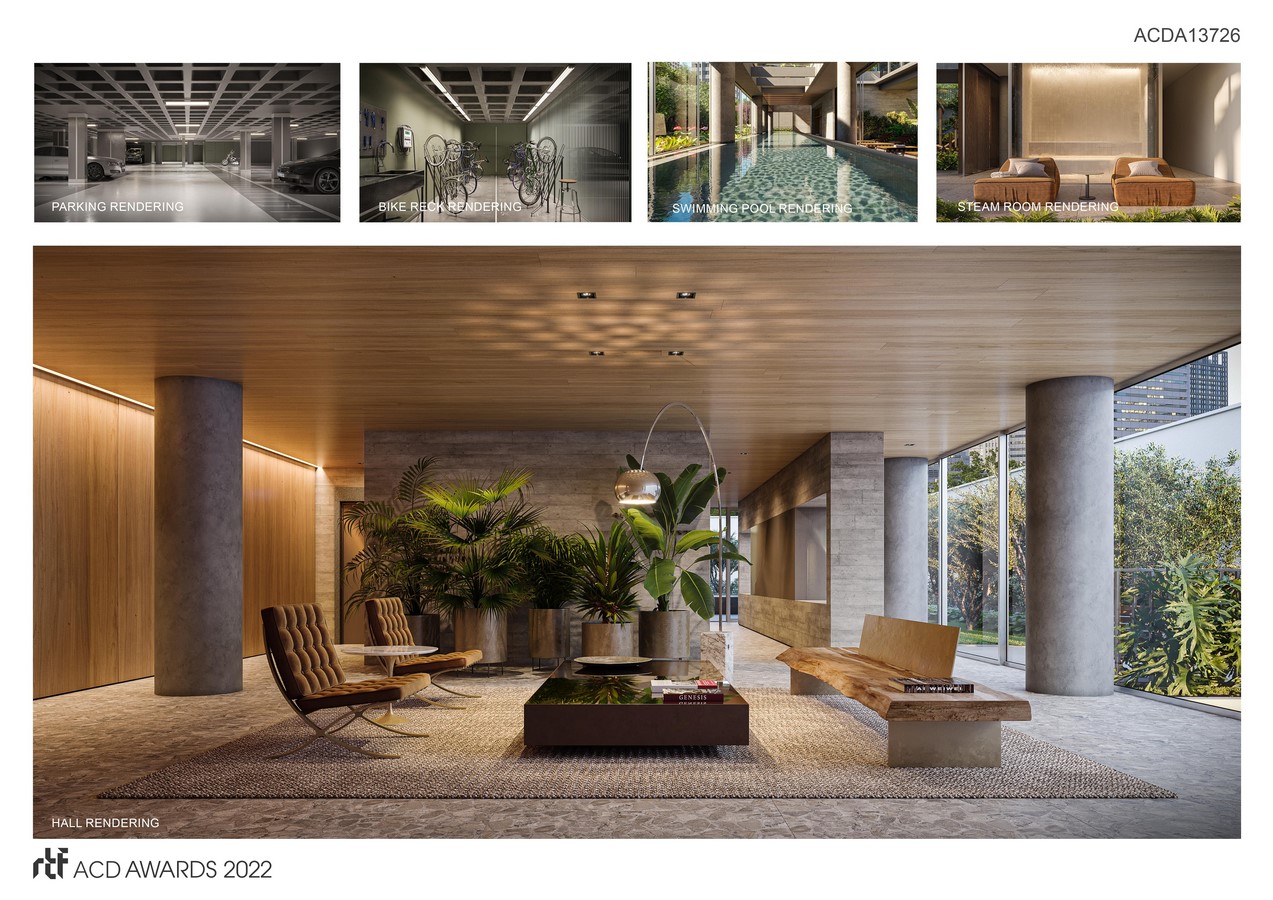 Consultants: Projeto Academia (gym); Arpa (accessibility); Echo (acoustics); PBSE (definitive anchorage); WSAR (air conditioning); Hayden (central vacuum); P&S (frames); Nitsche (visual communication); CHP (coordination); SPHE (electrical and hydraulic); Avila (structure); MGA (foundations); Yusuf (garage); Saoseg (fire protection); Regatec (irrigation); Studio IX (light engineering); Beltec (metallic); Cardim (landscape); CA2 (thermal and lighting report); CTE (certification of sustainability); Addor (sealing);K2 Arquitetura (ventilation).