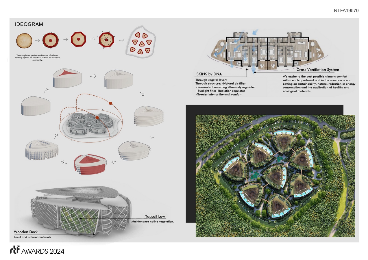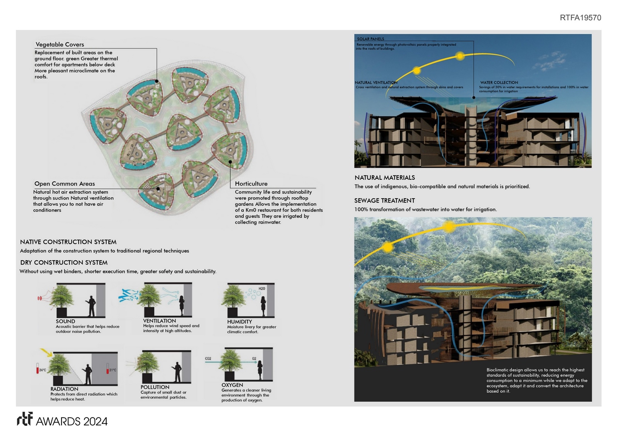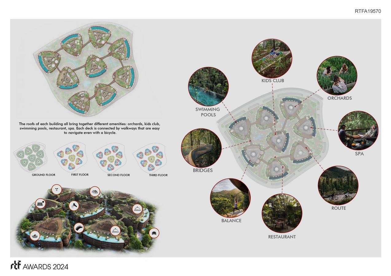 Rooftops not only serve as vantage points for individual pools but also as environmental canvases, hosting sustainable practices such as solar panels, rainwater harvesting, and Km0 restaurants promoting local, sustainable production. Embracing an organic approach, the construction phase employs traditional techniques, dry construction methods, and natural materials, showcasing a profound respect for the environment. The architecture goes beyond aesthetics, incorporating a skin system that functions as a natural air filter, regulating humidity and solar radiation. The inclusion of plants acts as a sound barrier within the buildings, creating an immersive and tranquil living experience.