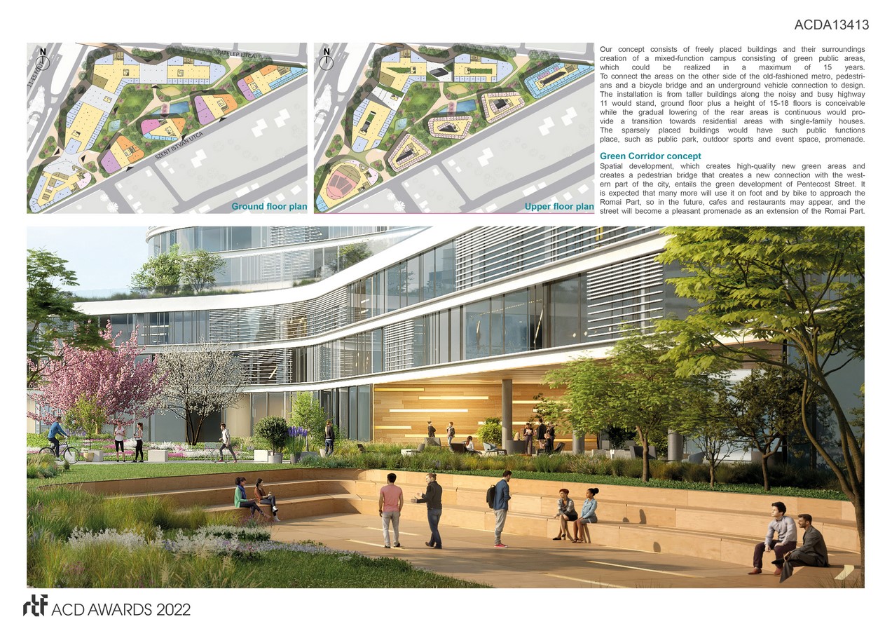 Under the buildings in the master plan, we envisioned a cohesive, walkable parking system that would serve the visitors and operate as a P + R in some parts for those traveling to the campus by public transport. For more accessible access to the planned North Buda City Center Metro line 5 stop, we envisioned a pedestrian and bicycle bridge, which not only serves the city center but the Metro line 5 stop rails and the main road.