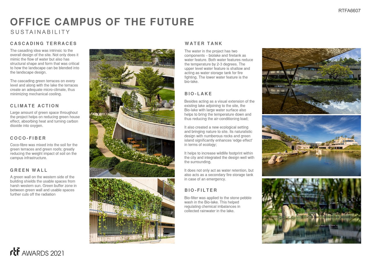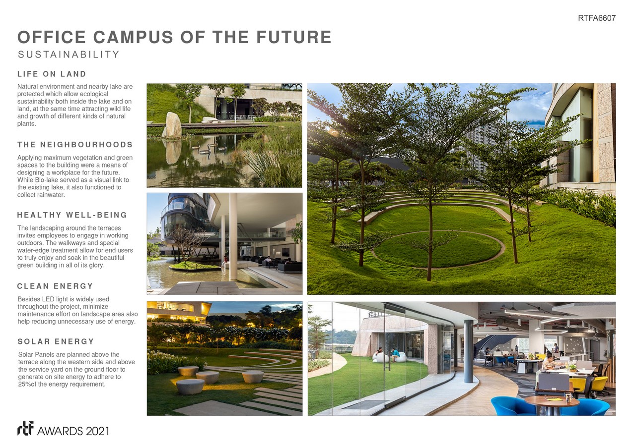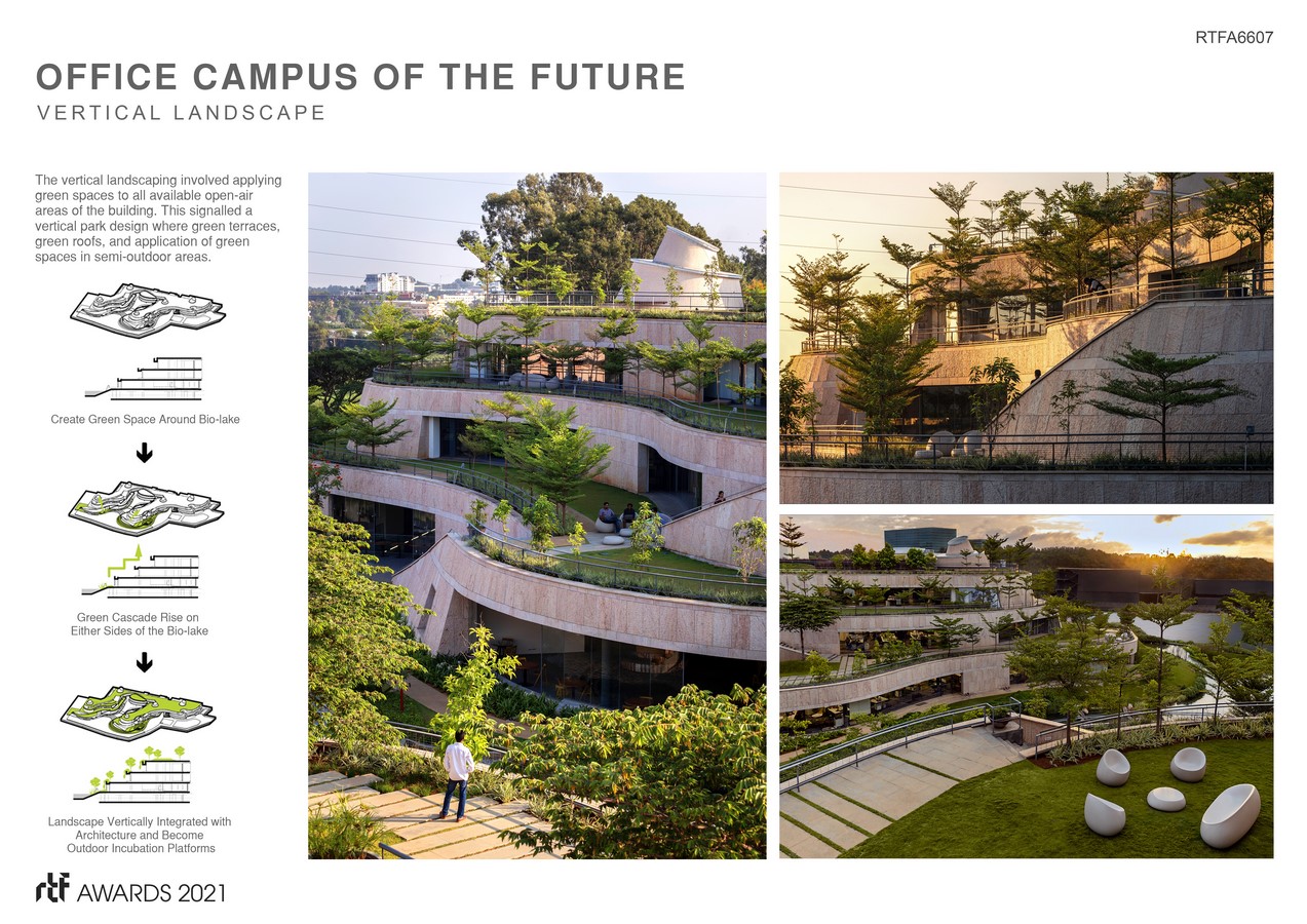 Sequences of green terraces, sky roofs and balcony gardens integrated the landscape into the building as vertical gardens. The building with its seamless outdoor indoor connectivity and the landscape with a series of interlinked pathways significantly fosters interaction among employees.