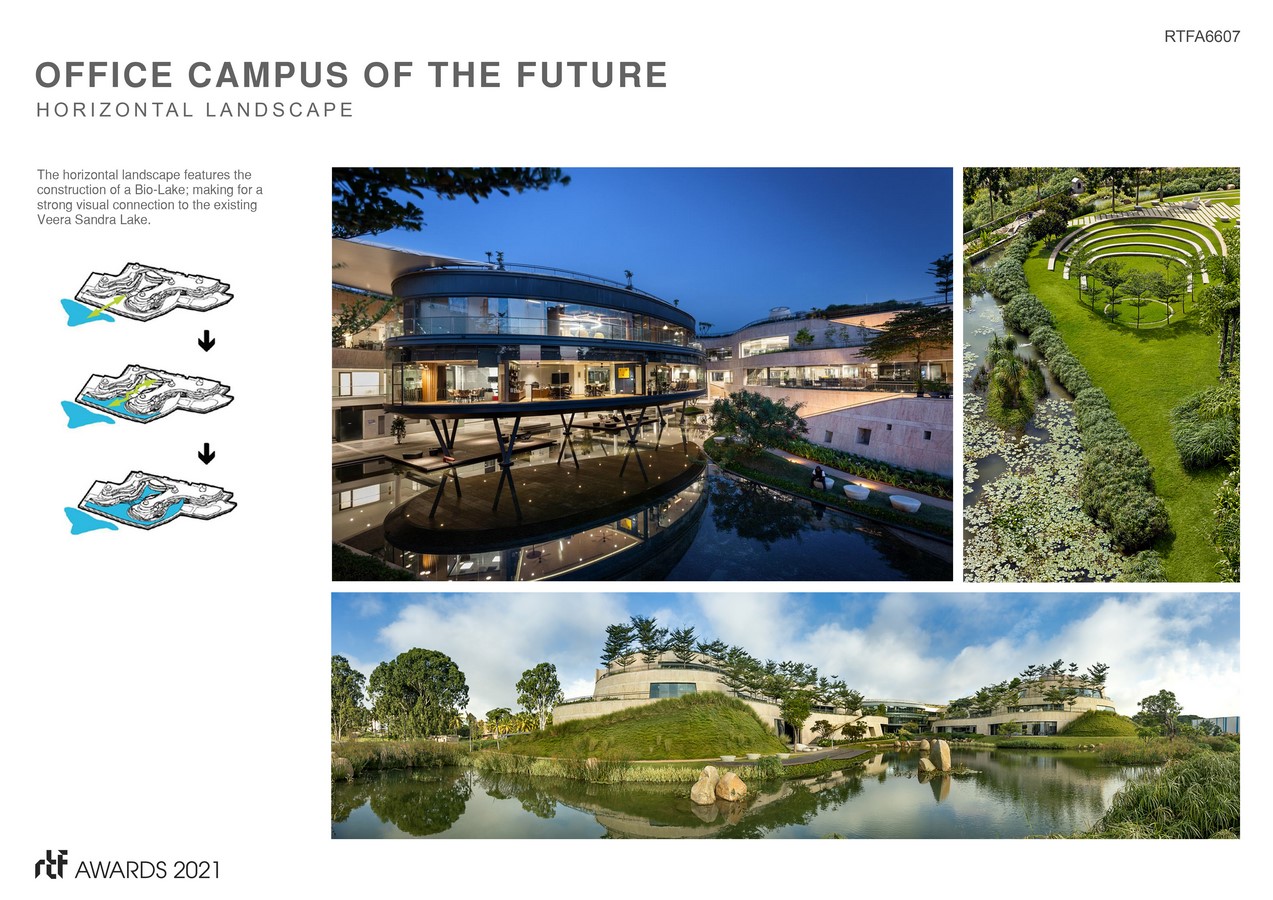 Designed as visual extension of an existing lake adjoining the site and imagined as key feature, the Bio-lake brings nature and wildlife into the middle of the campus while reflecting the sculptural façade of the building. It is further connected perceivably with a central pool through a series of cascades where stone boulders in water simulate a natural stream within the park. The new landscape and campus blends beautifully, ecologically and seamlessly into the existing landscape.