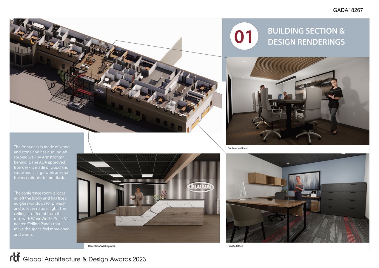 The goal of the project was to design an eye-catching front entrance that would leave a lasting impression. The team achieved this by creating a feature wall, exposed beams, and a custom-made reception desk. As you walk from the parking lot, through the new vestibule, and up the stairs into the reception area, you’ll notice many intricate details to admire, including custom metal stairs with red stringer. The reception desk is crafted from wood and stone and is accompanied by an acoustic Armstrong © slat wall behind it. The desk features a high ADA counter and a working area for the multitasking receptionist.
