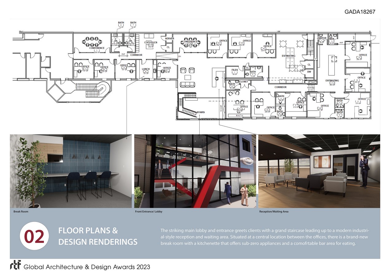The objective was to create an industrial-looking space that allows for privacy as well as collaboration. The private offices were placed strategically around the estimating areas, while the reception area was designed to be adjacent to the front entry. The Pionarch Design team provided the layout, the renderings, and a detailed set of construction plans. Pionarch selected finishes, furniture, and plumbing fixtures for the project including lighting fixtures, paint colors, and accessories. They collaborated with the owners on millwork design for the kitchenette and break room, as well as specialty offices with table tops to accommodate large drawings. In addition to the interior design, the scope of work for the front facade includes sign design and specifications of the exterior finishes.