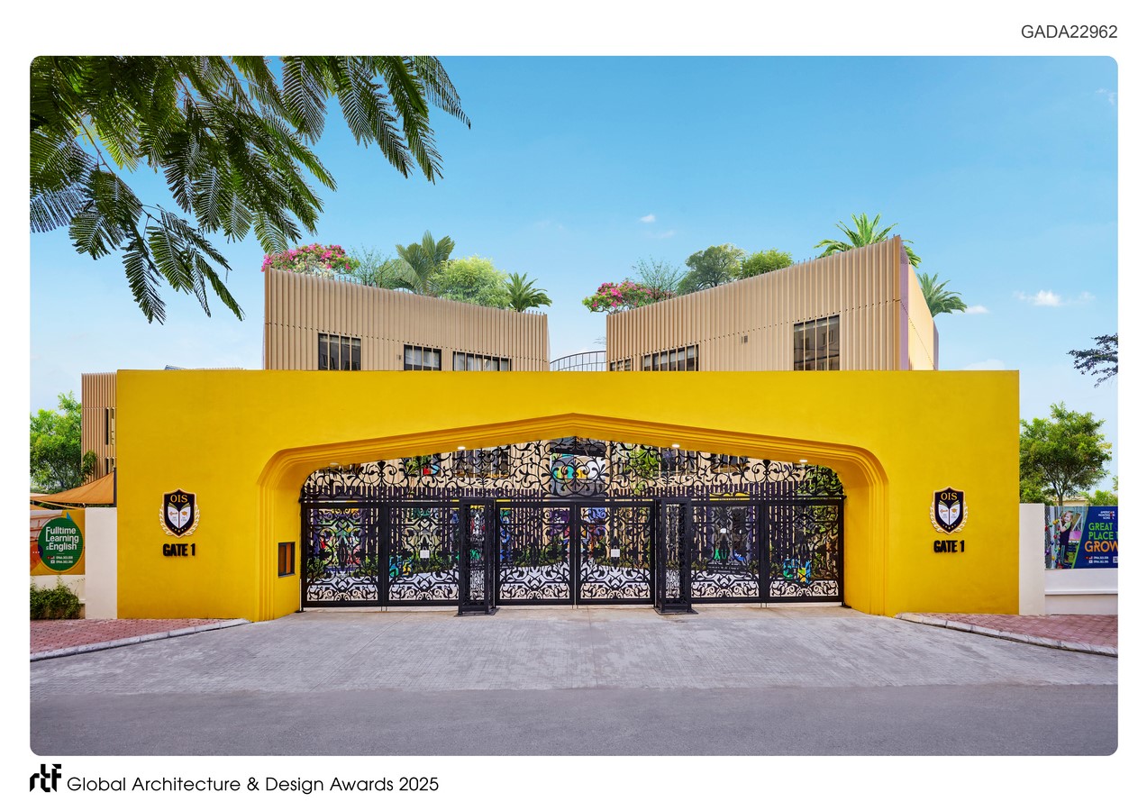 The main gate, designed as OIS’s signature, had the bright yellow logo illuminating the front and was integrated with the traditional arch of Oxford colleges’ architecture, to which the school curriculum was linked, in a modern way. The gate became a welcoming grand entrance, embracing all pupils, parents, and teachers.