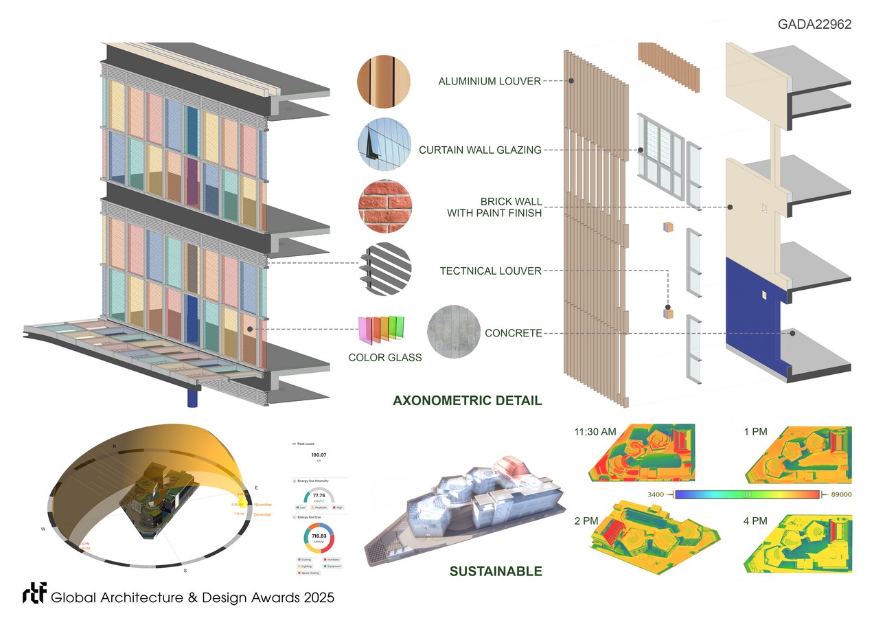 Passing through the alley revealed a vast and expansive internal courtyard, the heart of the school. The courtyard was vibrant with three major colors on its surface, breaking the geometry psychologically and visually. Looking up, an array of colorful glazing systems created closed rainbow corridors for levels 2 and 3. Children greatly enjoyed playing along these corridors. This space even turned into an informal learning place for groups. The colors integrated three out of seven colors of a rainbow. On sunny days, the corridors were filled with sunlight, casting colorful light onto walls and floors.