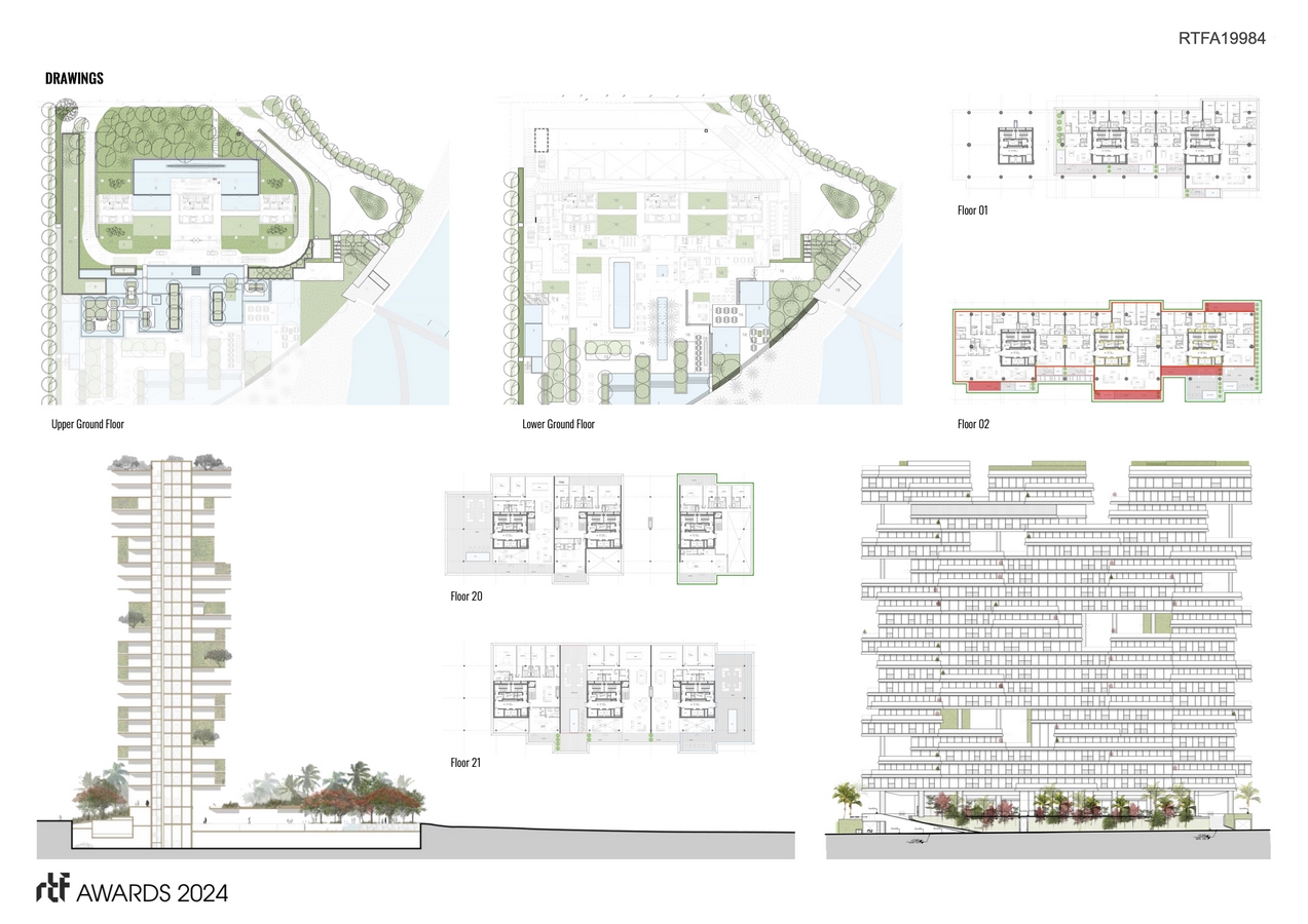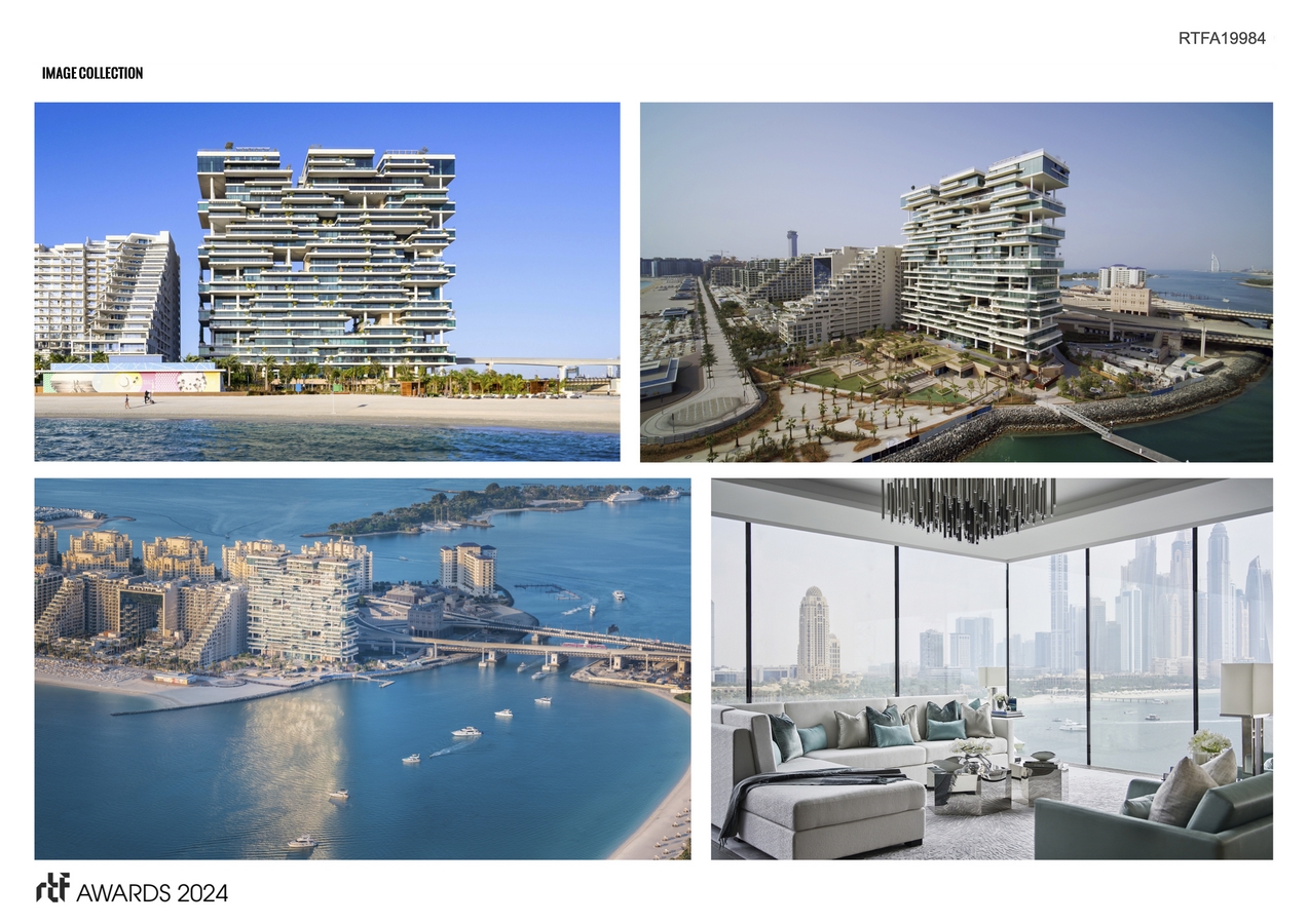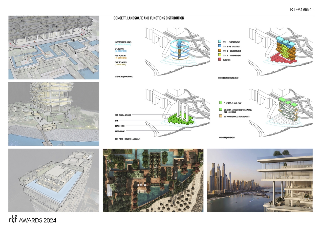 The project takes full advantage of the panoramic views of the palm to the North, and the Dubai marina to the South, while simultaneously providing a sense of arrival and iconography at the entrance of the island.