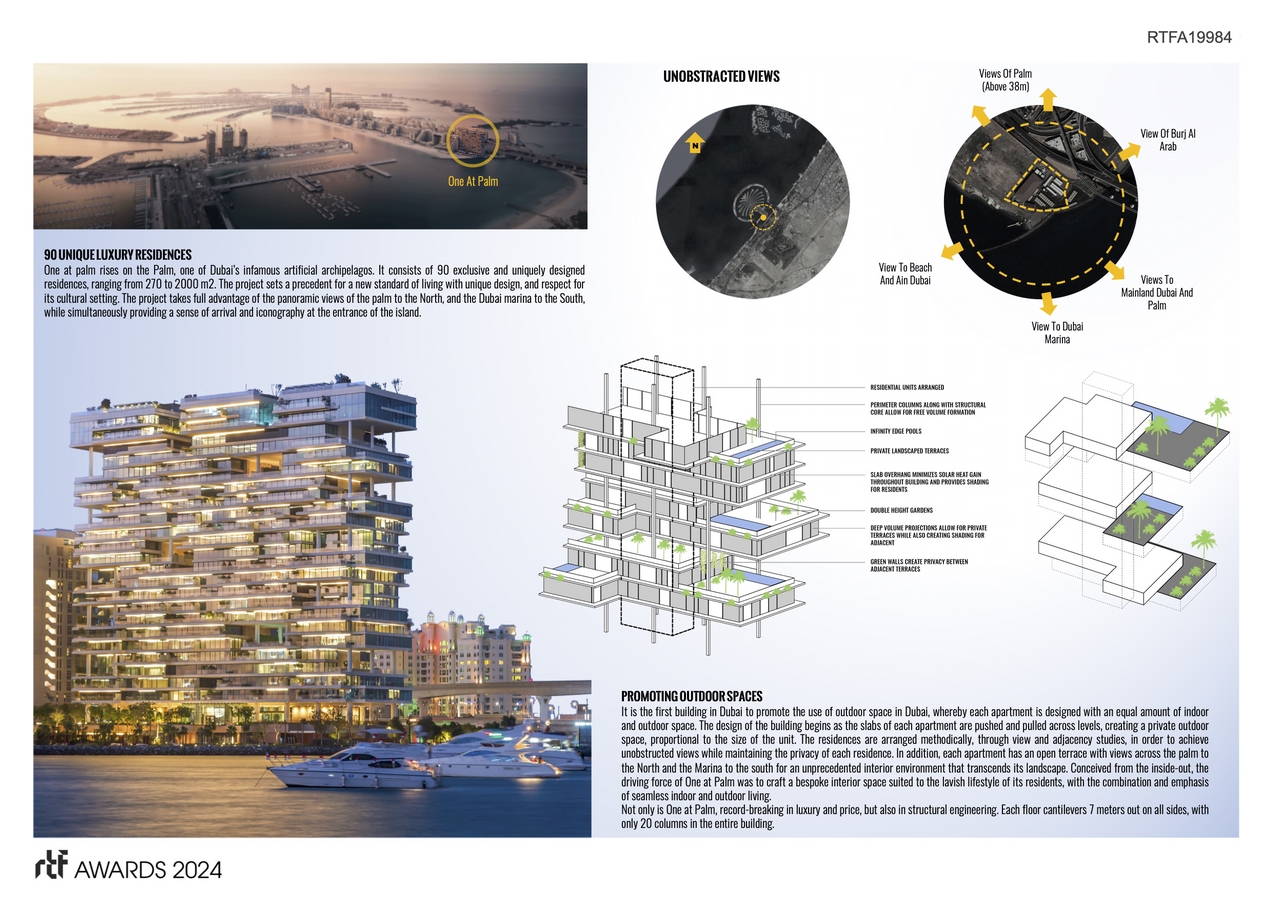 One at palm rises on the Palm, one of Dubai’s infamous artificial archipelagos. It consists of 90 exclusive and uniquely designed residences, ranging from 270 to 2000 m2. The project sets a precedent for a new standard of living with unique design, and respect for its cultural setting.