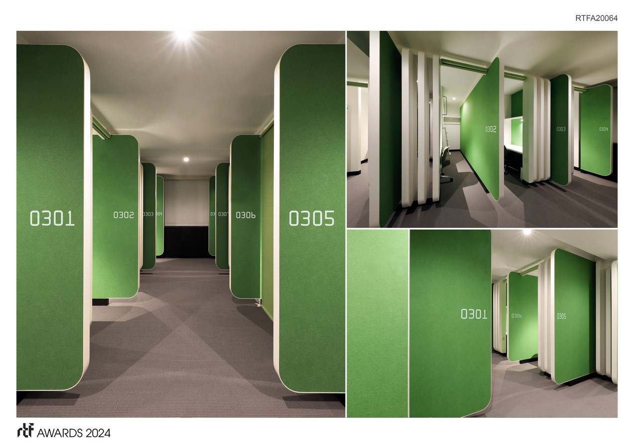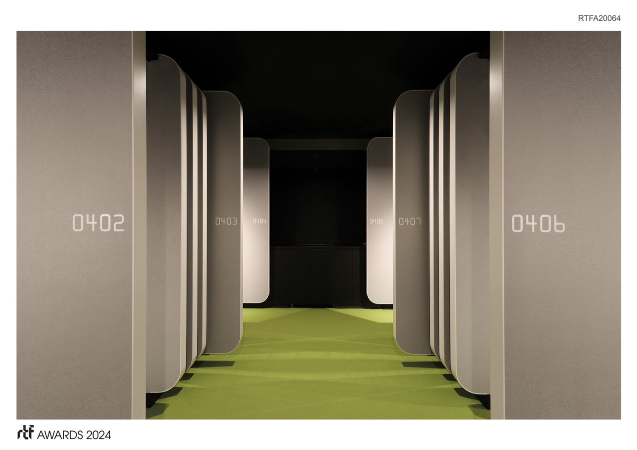 To ensure Orico’s identity permeates every aspect of the space, the design leverages ‘credit card’ motifs throughout the interior and signage elements. Specifically, the unique notation of credit card numbers, a 4-digit sequence repeated four times for a 16-character display, inspired the representation of floor and room numbers (e.g., the second floor is indicated as 0002). This design employs the “Farrington 7B” font, a credit card international standard recognized globally for its error-free readability.