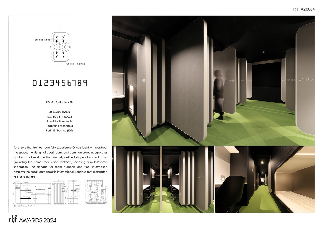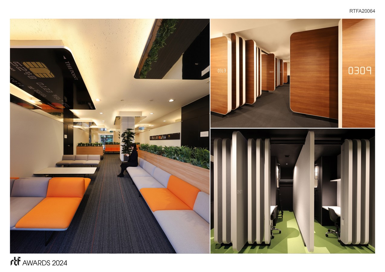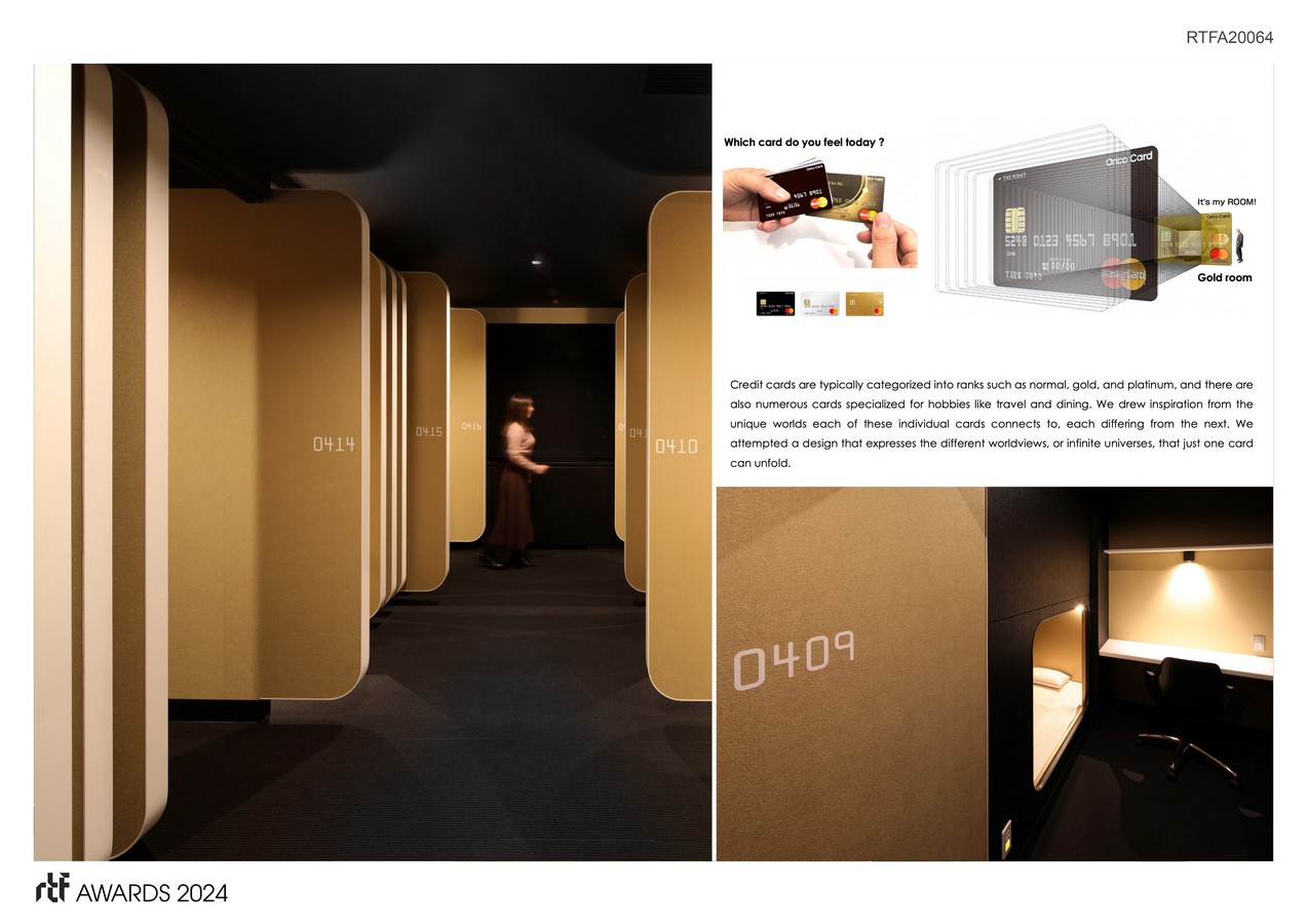 Each of the six accommodation rooms is themed after the variety of cards Orico’s issues, such as “Gold Card,” “Platinum Card,” and “Black Card,” to manifest the distinctive world each card represents. The partition shapes reference the precise shape of credit cards, including corner radius and thickness. Similarly, functional spaces like toilets and smoking rooms feature room signs designed after the credit card motif.