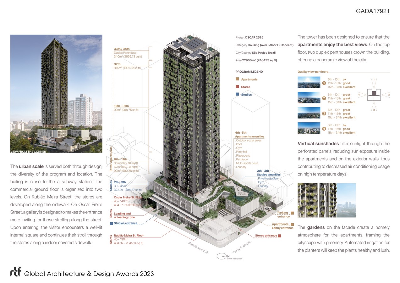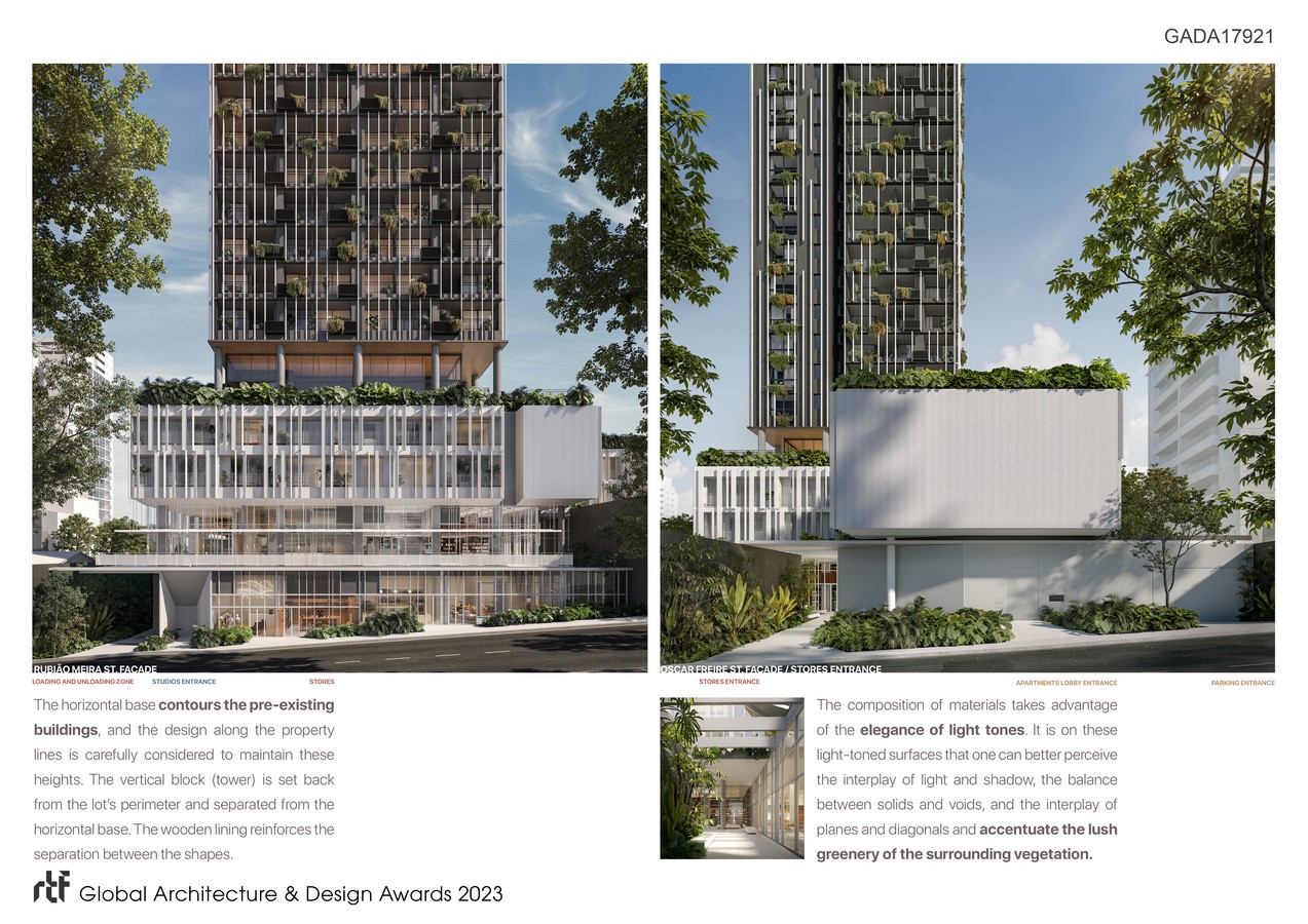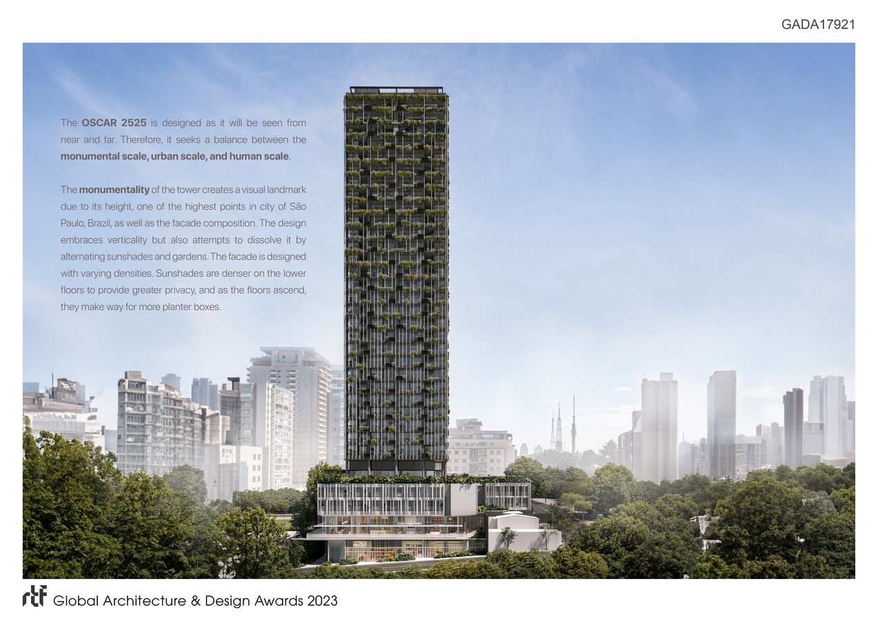 The monumentality of the tower creates a visual landmark due to its height, one of the highest points in city of São Paulo, Brazil, as well as the facade composition. The design embraces verticality but also attempts to dissolve it by alternating sunshades and gardens. The facade is designed with varying densities. Sunshades are denser on the lower floors to provide greater privacy, and as the floors ascend, they make way for more planter boxes.