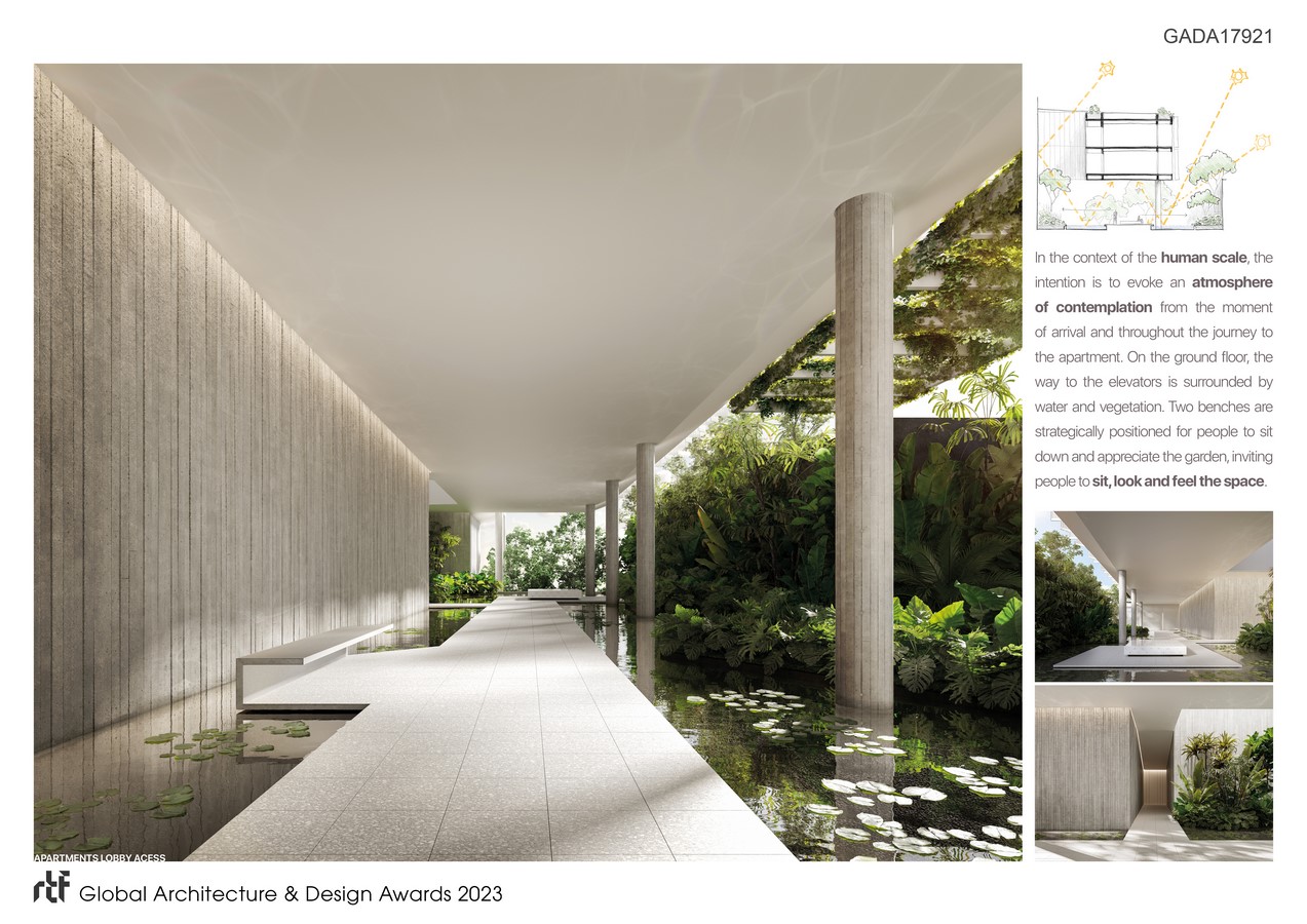 In the context of the human scale, the intention is to evoke an atmosphere of contemplation from the moment of arrival and throughout the journey to the apartment. On the ground floor, the way to the elevators is surrounded by water and vegetation. Two benches are strategically positioned for people to sit down and appreciate the garden, inviting people to sit, look and feel the space.
