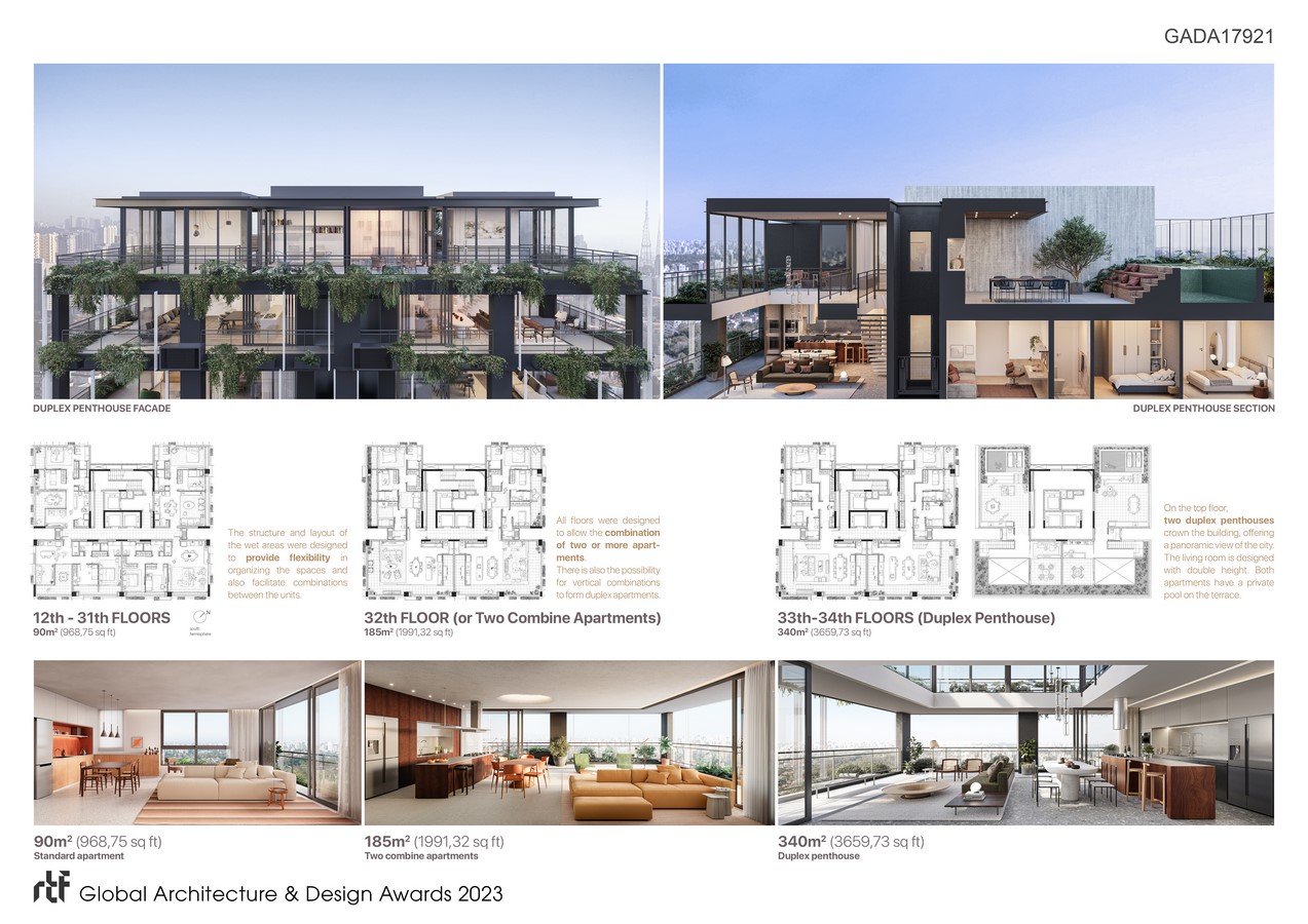 The tower has been designed to ensure that the apartments enjoy the best views. On the top floor, two duplex penthouses crown the building, offering a panoramic view of the city. The structure and layout of the wet areas were designed to provide flexibility in organizing the spaces and facilitate combination between the units.