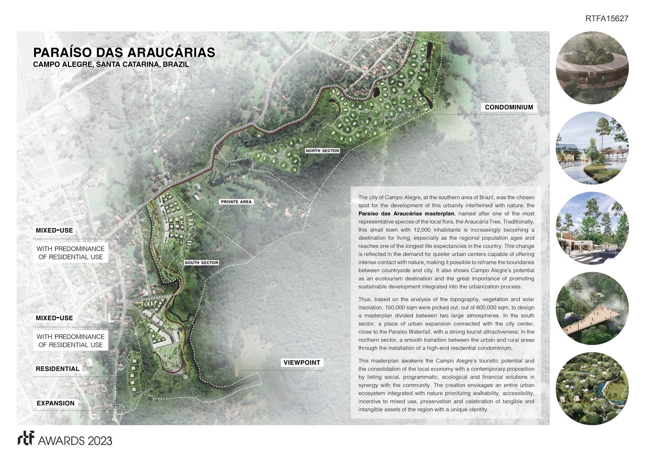 This masterplan awakens Campo Alegre’s touristic potential and the consolidation of the local economy with a contemporary proposition by listing social, programmatic, ecological and financial solutions in synergy with the community. The design envisages an entire urban ecosystem integrated with nature prioritizing walkability, accessibility, incentive to mixed use, preservation and celebration of tangible and intangible assets of the region with a unique identity.