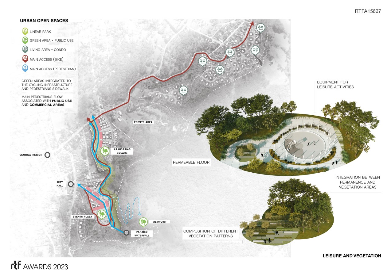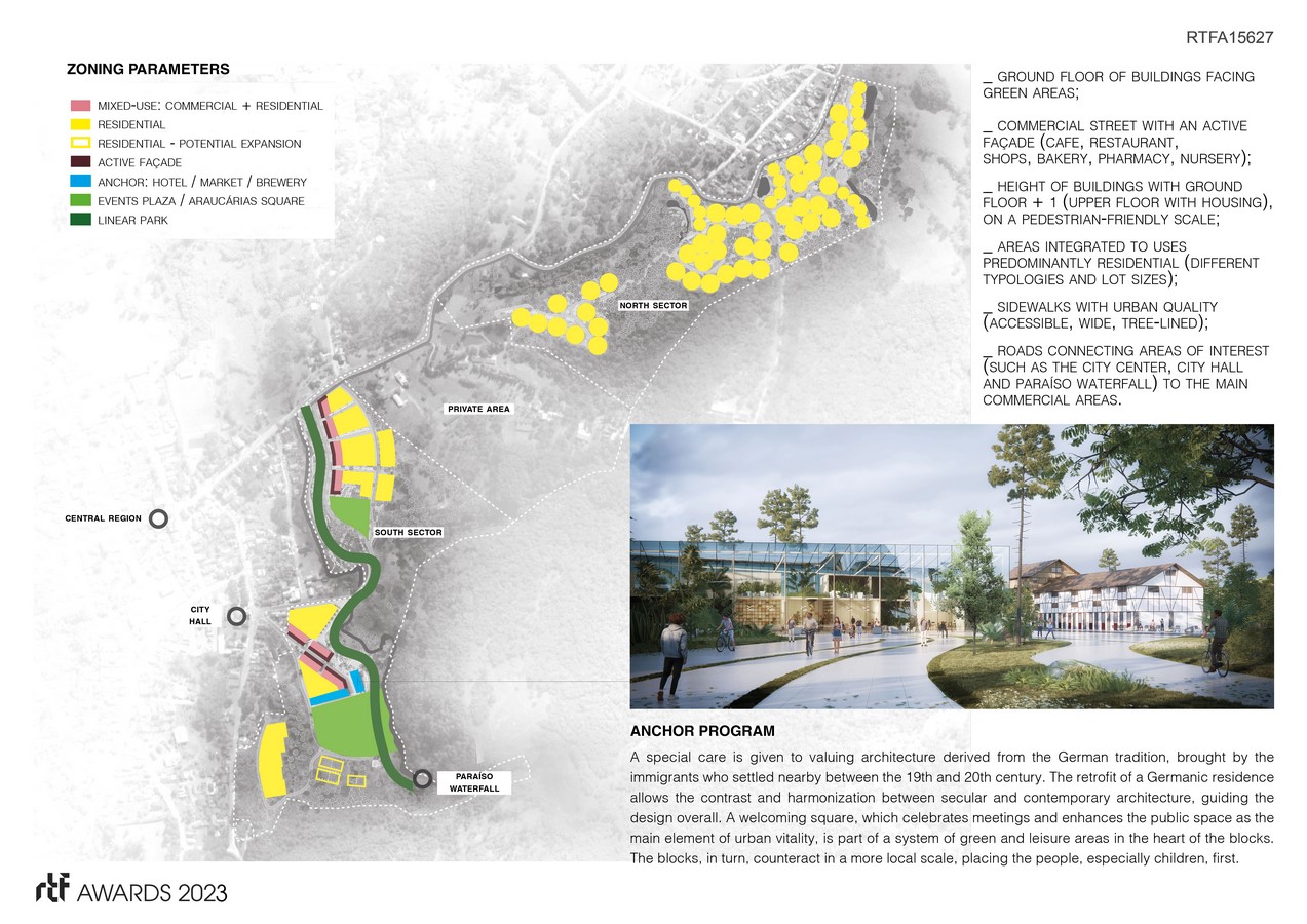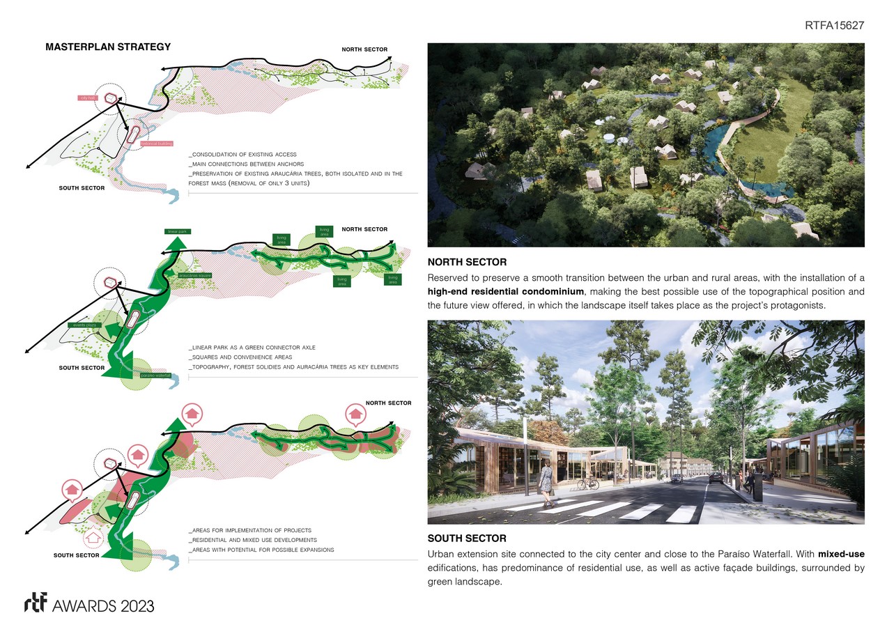 Thus, based on the analysis of the topography, vegetation and solar insolation, 150,000 sqm were picked out, out of 600,000 sqm, to design a masterplan divided between two large atmospheres. In the south sector, a place of urban expansion connected with the city, close to the Paraíso Waterfall, with a strong tourist attractiveness, the buildings reach the maximum height of the ground floor plus 1 floor, eventually reaching 3 floors. A viewpoint will serve as a guideline for contemplating the waterfall; and a special care is given to valuing architecture derived from the German tradition, brought by the immigrants who settled nearby between the 19th and 20th century. The retrofit of a Germanic residence allows the contrast and harmonization between secular and contemporary architecture, guiding the design overall. A welcoming square, which celebrates meetings and enhances the public space as the main element of urban vitality, is part of a system of green and leisure areas in the heart of the blocks. The blocks, in turn, counteract in a more local scale, placing the people, especially children, first.