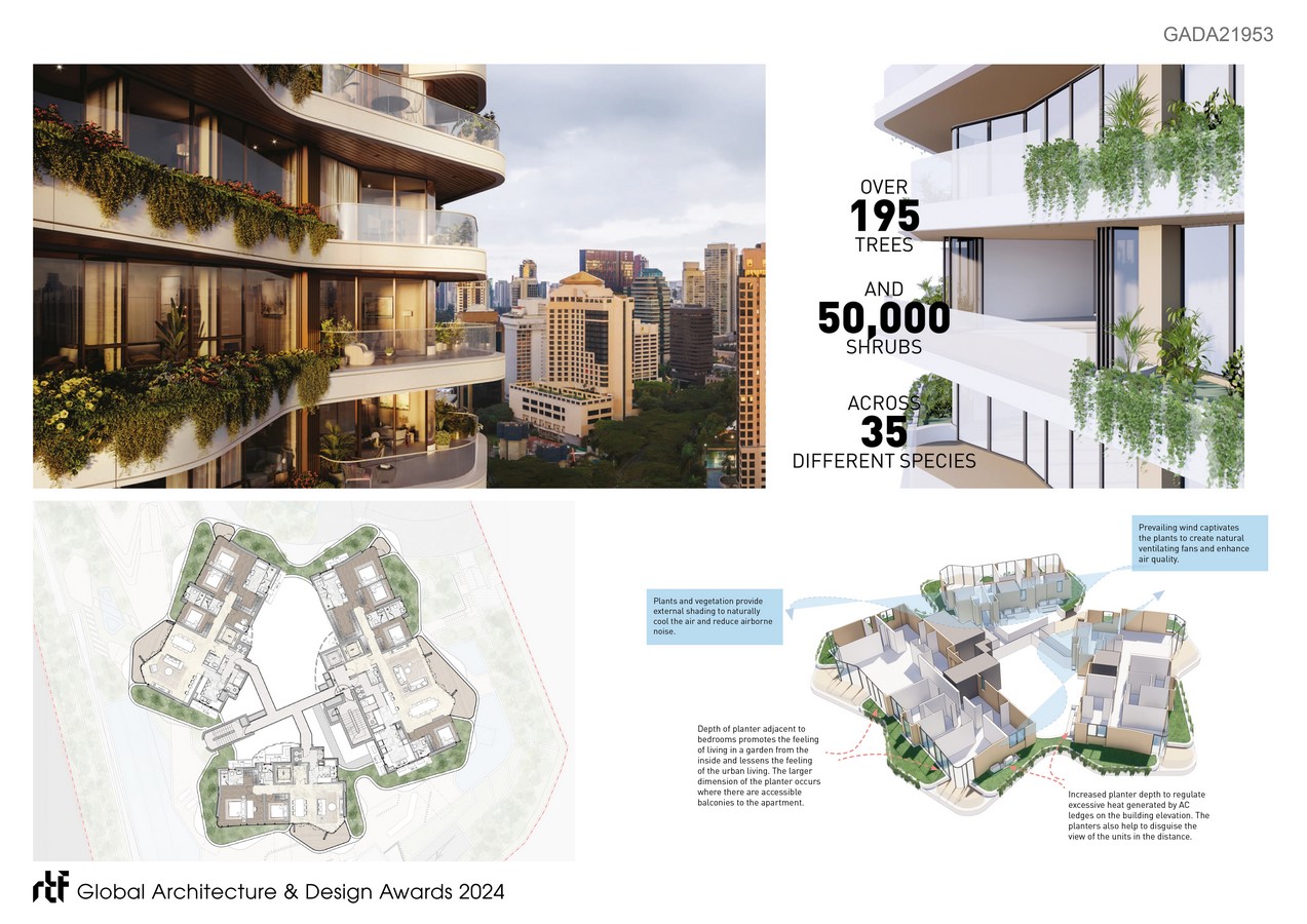 This intimate relationship with nature increases resident comfort and improves the health and well-being of the occupants. The greenery adjacent to the bedrooms has been selected to be visually expansive, creating the sense of living in a garden and thereby breaking away from the traditional high-rise experience of urban living. Studies by our in-house research group have proven that establishing such immediate connections with nature in a home reduces stress and enhances happiness, comfort, and clarity of thought. The lush greenery also provides natural tools for increasing comfort, particularly in tropical areas where air conditioning is still a necessity. Taller plants act as natural shading for residents using their outdoor spaces. The undulation in the planters with the balconies merges indoor and outdoor spaces, allowing the greenery to temper the air when the doors are open. The planting of various species has been choreographed with the adjacent internal spaces to create a sensory experience, filtering the air when windows are open, acting as a natural environmental sound buffer in the prevailing wind, as well as providing visual delight to the residents.