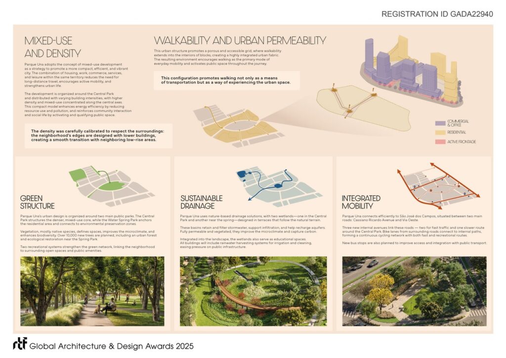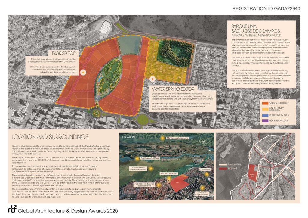 Located in one of the last major urban voids of São José dos Campos (SP), between the city’s most verticalized neighborhood and a protected environmental area with views of the Serra da Mantiqueira, Parque Una proposes a harmonious connection between urban fabric and natural landscape. It is a planned neighborhood that applies the principles of contemporary urbanism, focusing on people, mixed-use diversity, and sustainability.