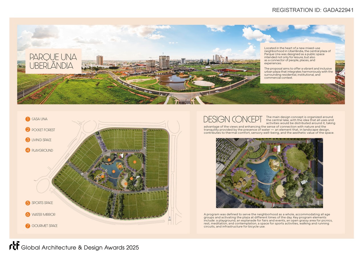 Located at the heart of a new mixed-use neighborhood in Uberlândia, the central plaza of Parque Una was designed not only for leisure, but to connect people, places, and experiences. The proposal aims to create a vibrant and inclusive urban plaza, harmoniously integrated with its surrounding residential, institutional, and commercial uses.