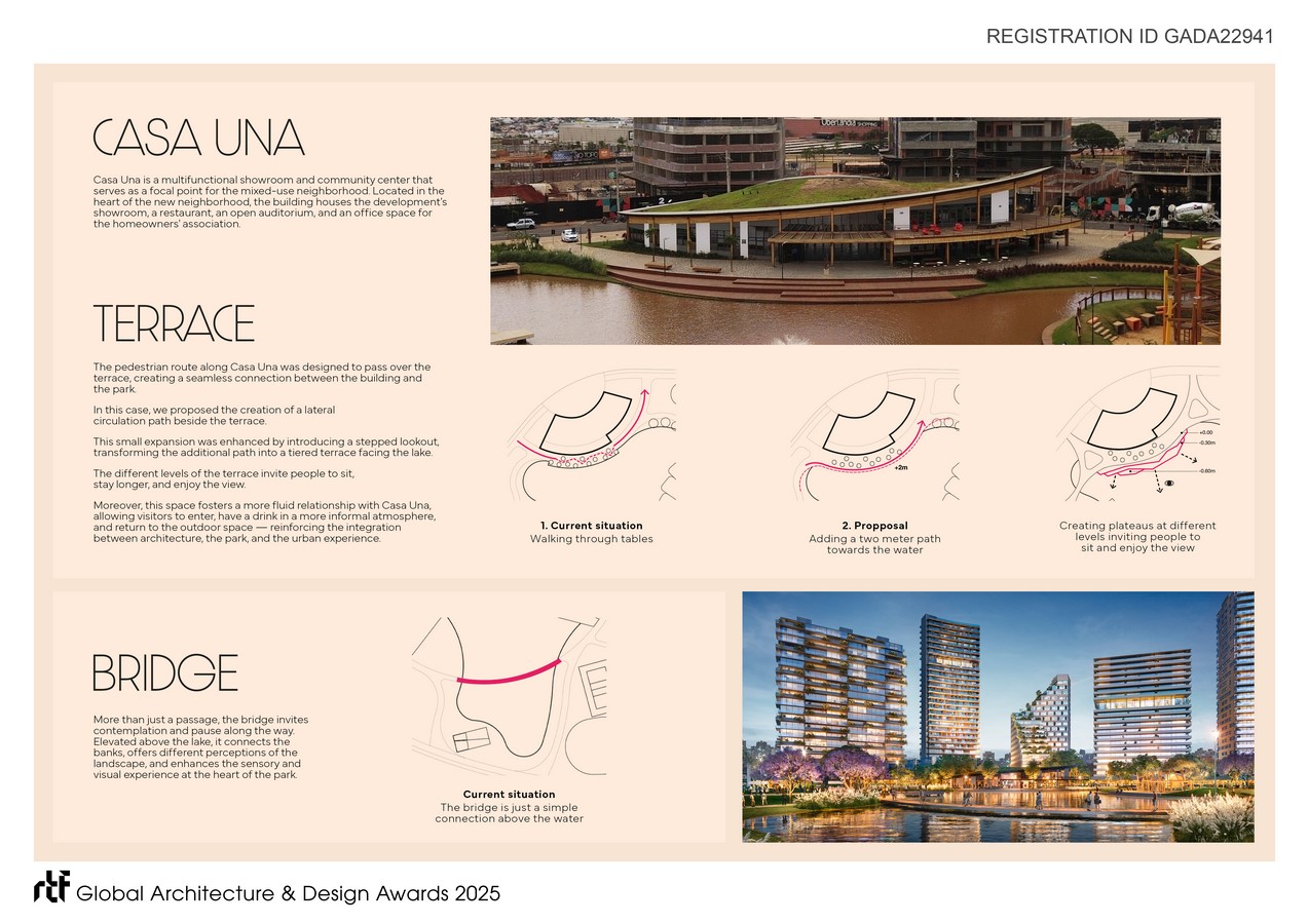Two architectural features strengthen the relationship between landscape and built form: a stepped terrace and an elevated bridge. Adjacent to Casa Una, the terrace offers levels facing the lake for gathering and reflection. The bridge crosses over the water, connecting both sides of the park and framing new landscape views.