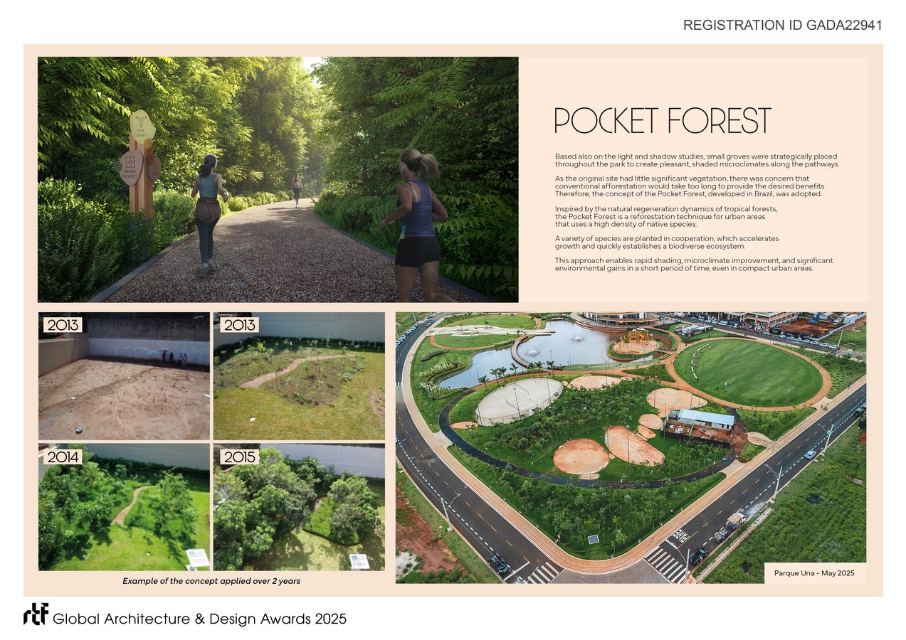 To accelerate shade and biodiversity, the project employed the Pocket Forest technique — a dense planting method using native species that grow cooperatively, inspired by tropical forest regeneration. Positioned along the main paths, these forests enrich the ecological and sensory experience of the plaza.