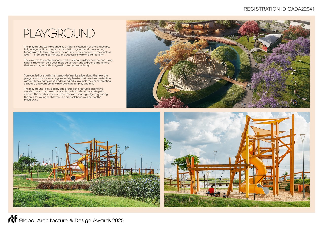 The playground follows the endless loop concept, blending into the landscape with paths that open into green islands. Accessible from all directions, it welcomes children of all ages. Natural materials, iconic wooden structures, and a green setting foster playful interactions.
