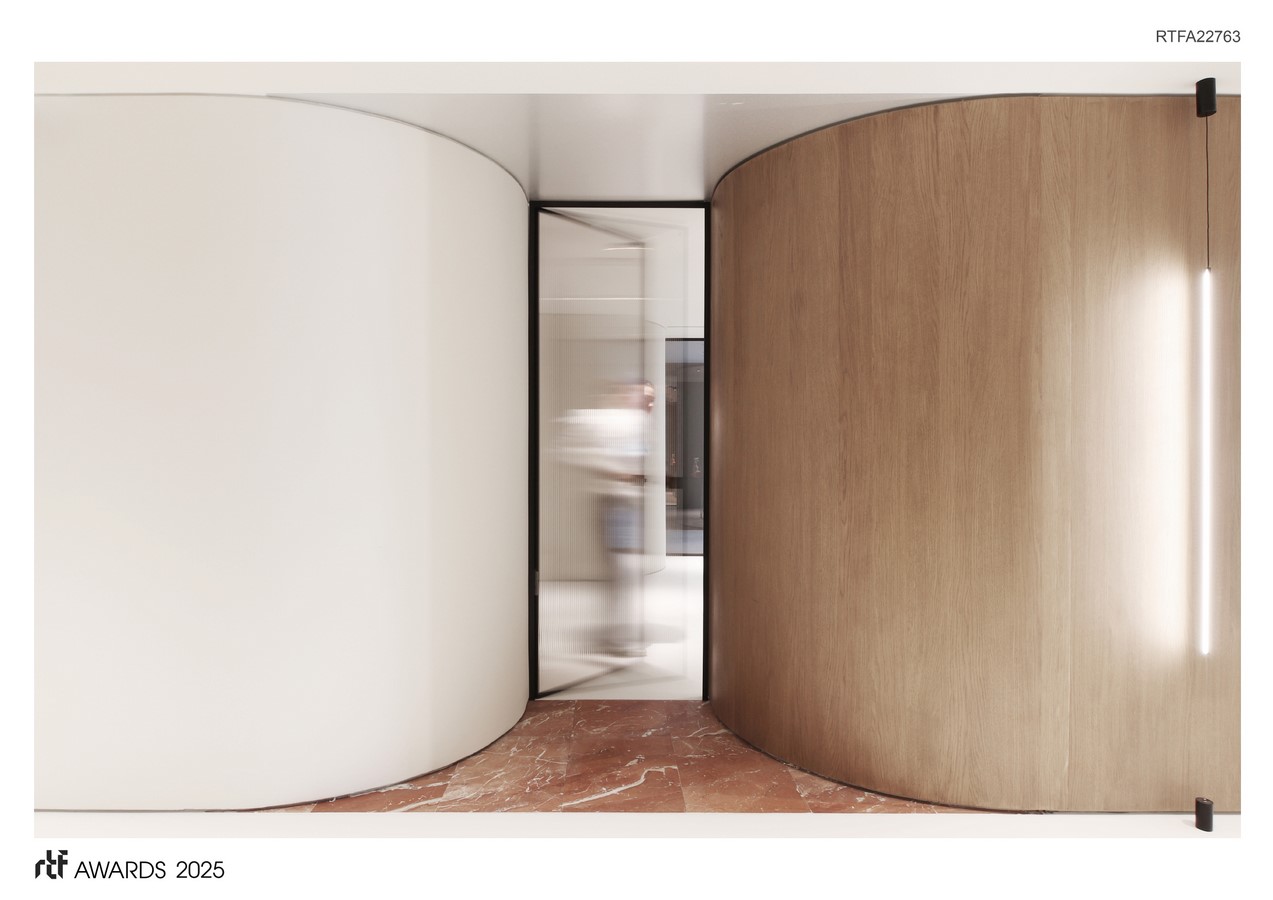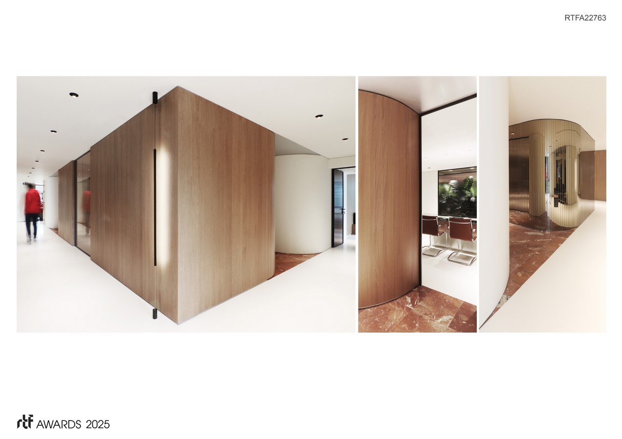 The uniform white floor also makes the petals appear as if they are floating, further lightening the overall composition. In the recesses formed by the clusters of petals, two additional materials are introduced. The ceiling is clad in stainless steel, whose subtle gloss reflects the vertical elements and enhances the sense of height and uplift. On the floor, Rosso Alicante marble with its distinctive orange-red hue is used to mark “thresholds”—the transition from the communal corridor to the private space of each office.