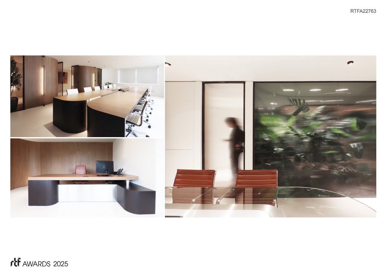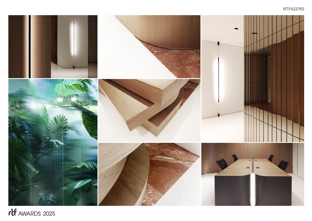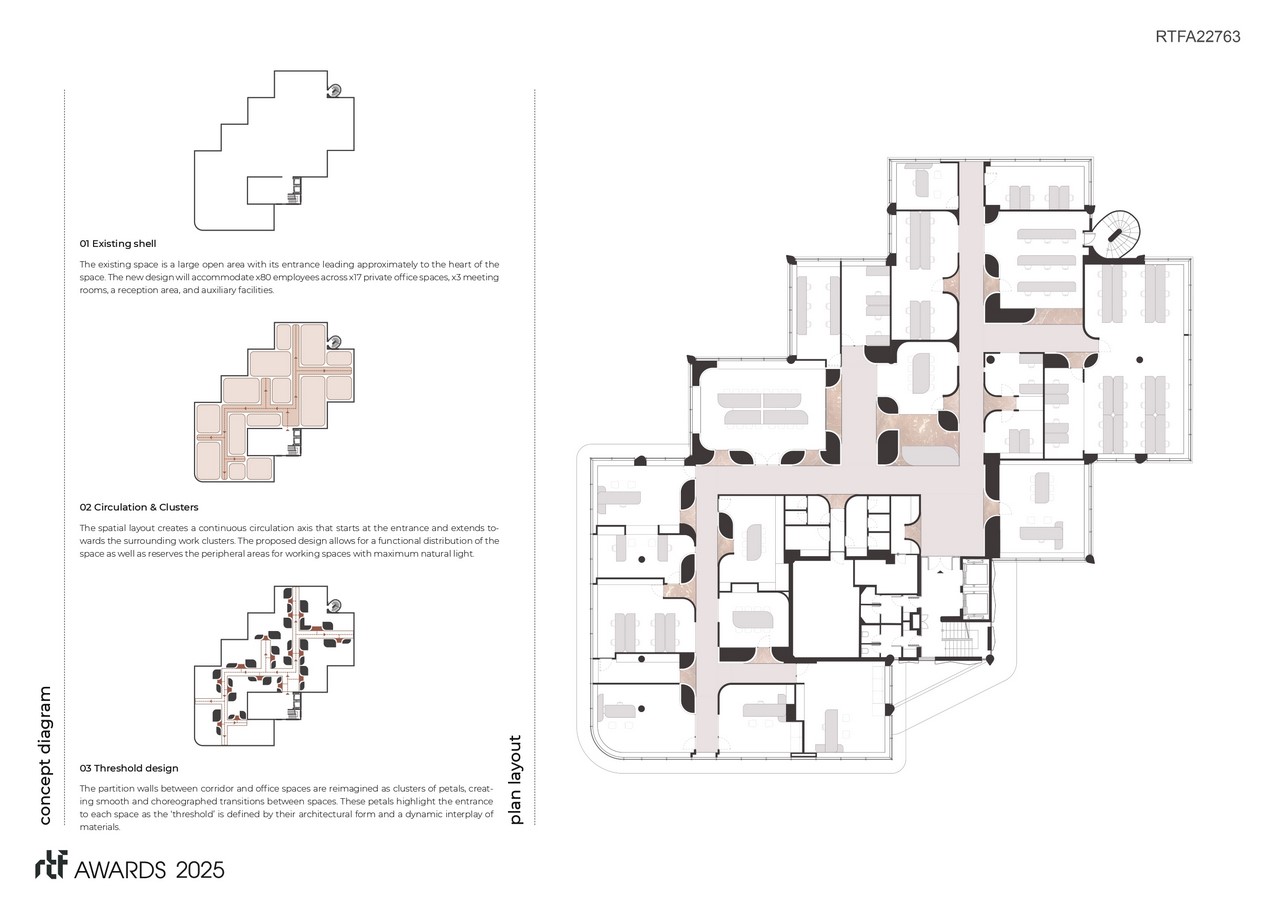 The design concept is based on deconstructing traditional partition walls and reimagining them as clusters of petals connected by glass elements. These petals create smoother and more choreographed transitions between spaces, making the experience of the environment more fluid and welcoming compared to sharp edges.