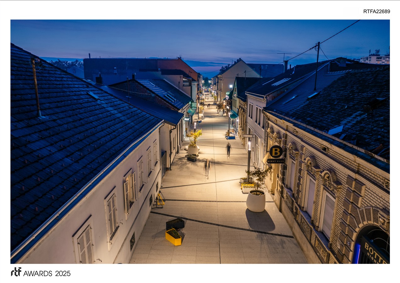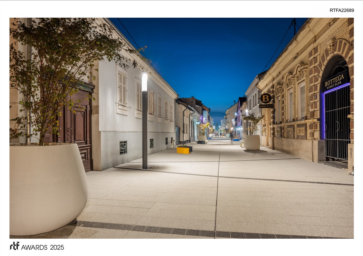 And when all of this is processed, the idea emerges naturally through the creative process. The newly renovated pedestrian zone is a contemporary public space characterized by an elegant, structured ground surface, modern urban furniture, and subtle, warm lighting. Its design is bold yet neutral in color, providing a stark contrast to the vibrant storefronts, facades, and numerous advertisements. For a new rhythm of the city.
