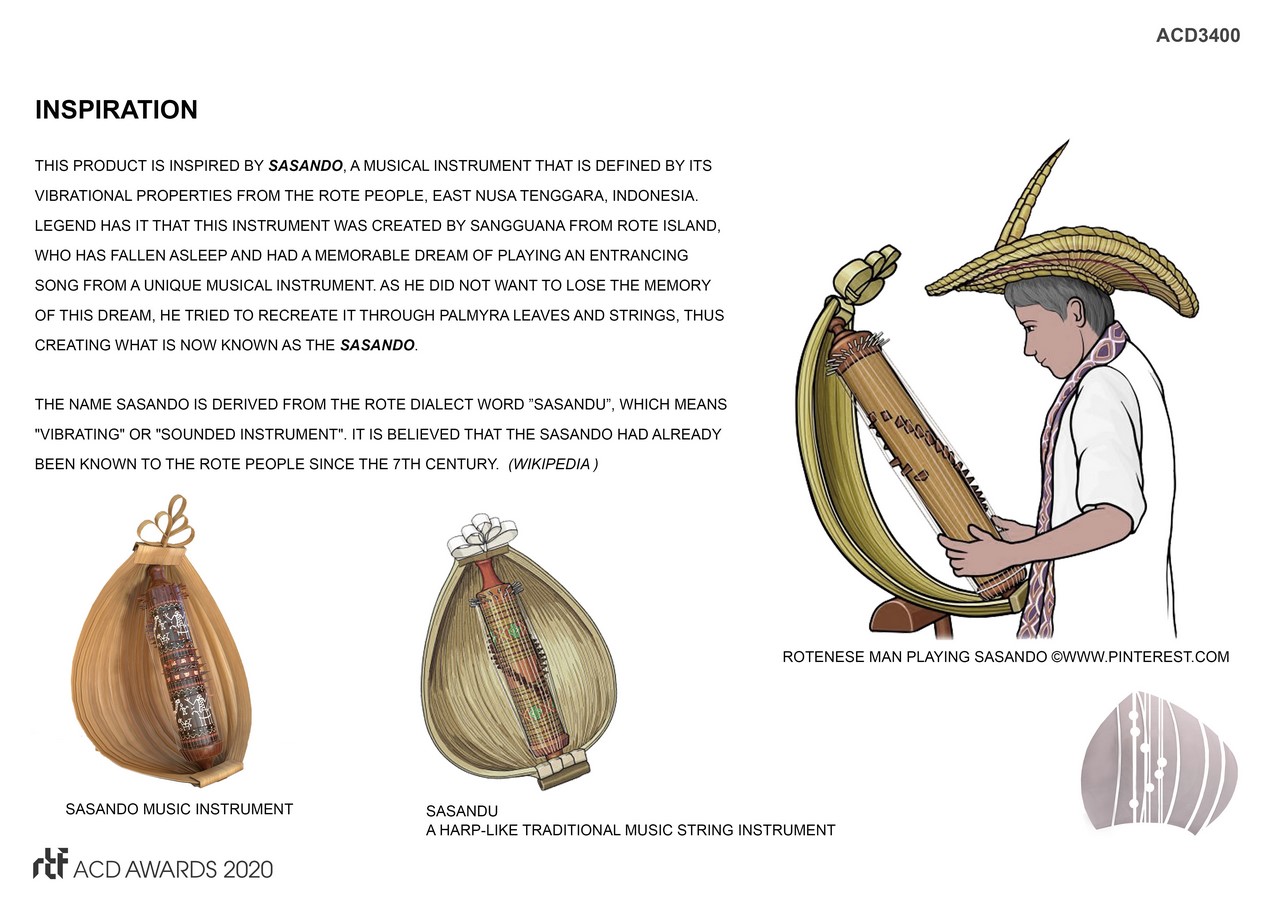 This product is inspired by Sasando, a musical instrument that is defined by its vibrational properties from the Rote people, East Nusa Tenggara, Indonesia. Legend has it that this instrument was created by Sangguana from Rote island, who has fallen asleep and had a memorable dream of playing an entrancing song from a unique musical instrument.