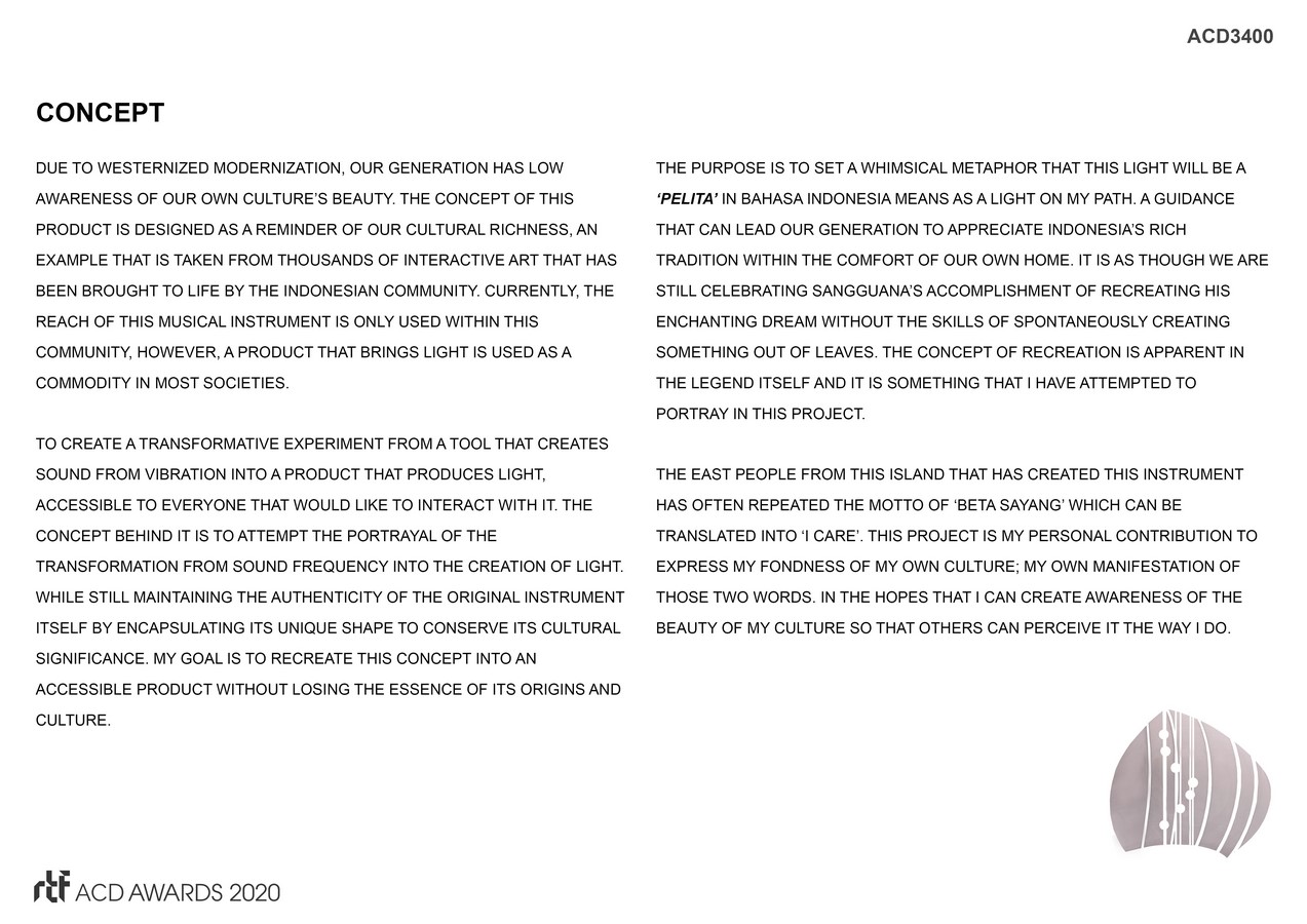 Due to westernized modernization, our generation has low awareness of our own culture’s beauty. The concept of this product is designed as a reminder of our cultural richness, an example that is taken from thousands of interactive art that has been brought to life by the Indonesian community. Currently, the reach of this musical instrument is only used within this community, however, a product that brings light is used as a commodity in most societies.