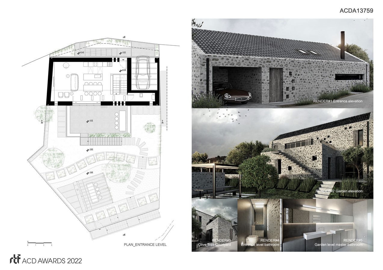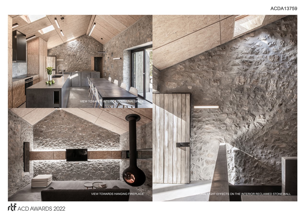 Thorough contextual and materiality research was done on how to incorporate dwelling in a contemporary manner into the surrounding. A starting point of creative departure was the industrial feel of a traditional stone stable, characteristic for the Peloponnese rural areas, with its low, long, and tiled shed roof appearance.