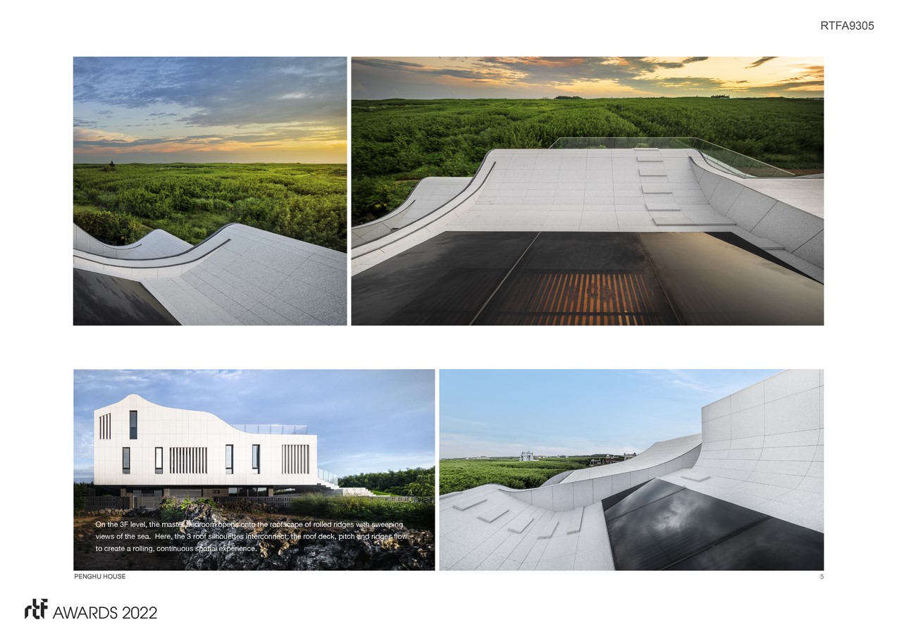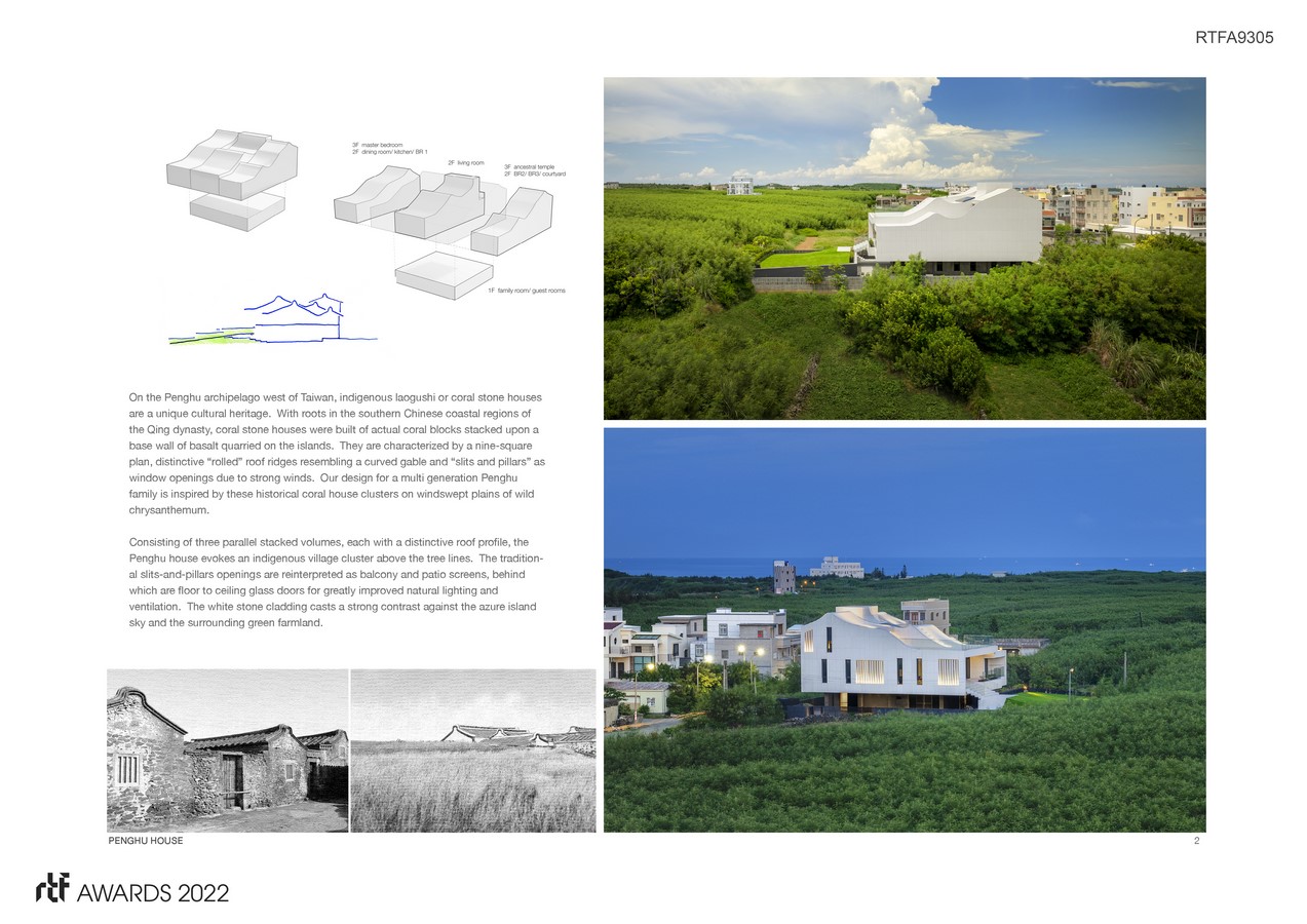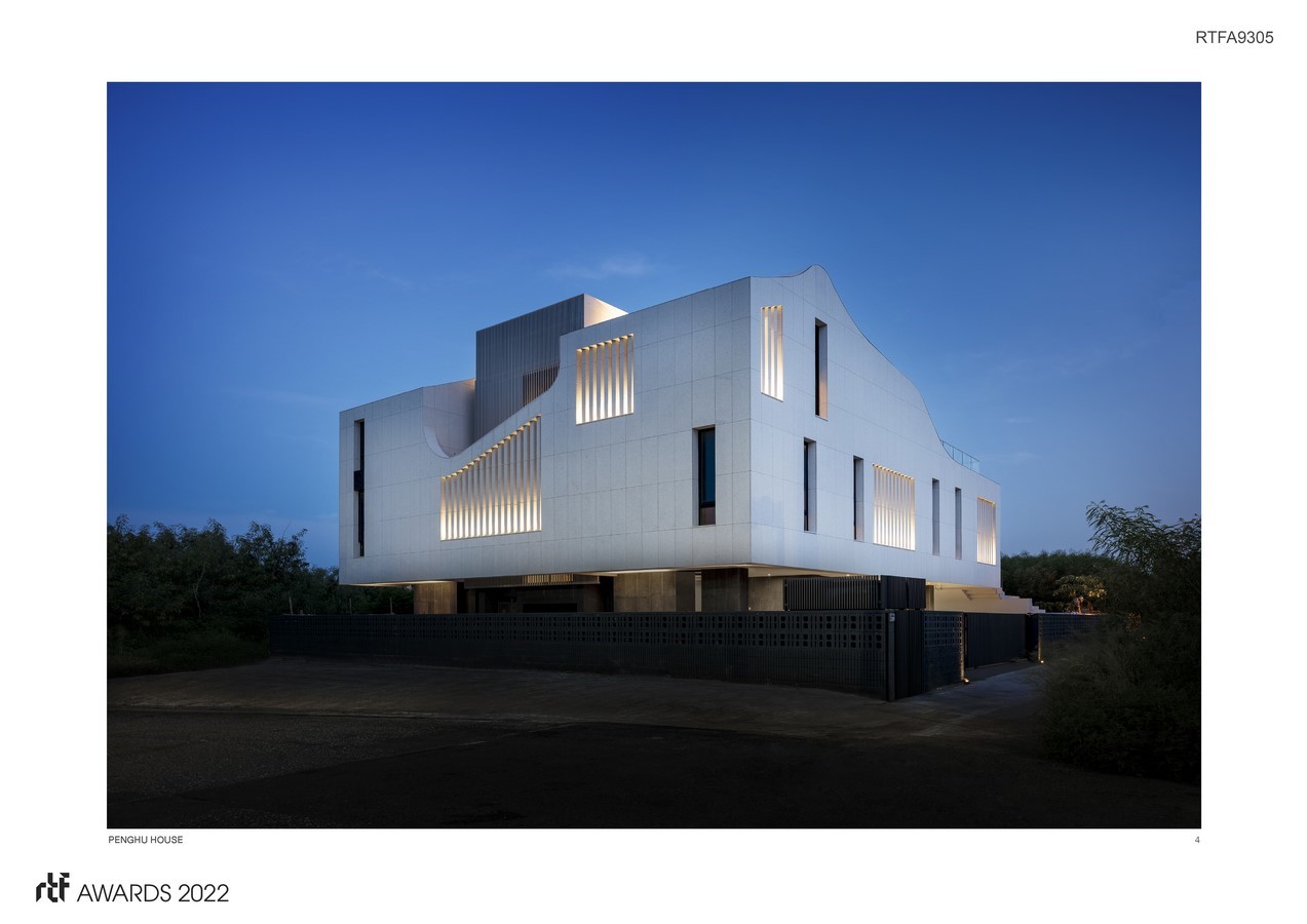 Consisting of three parallel stacked volumes, each with a distinctive roof profile, the Penghu house evokes an indigenous village cluster above the tree lines. The traditional slits-and-pillars openings are reinterpreted as balcony and patio screens, behind which are floor to ceiling glass doors for greatly improved natural lighting and ventilation. The white stone cladding casts a strong contrast against the azure island sky and the surrounding green farmland.