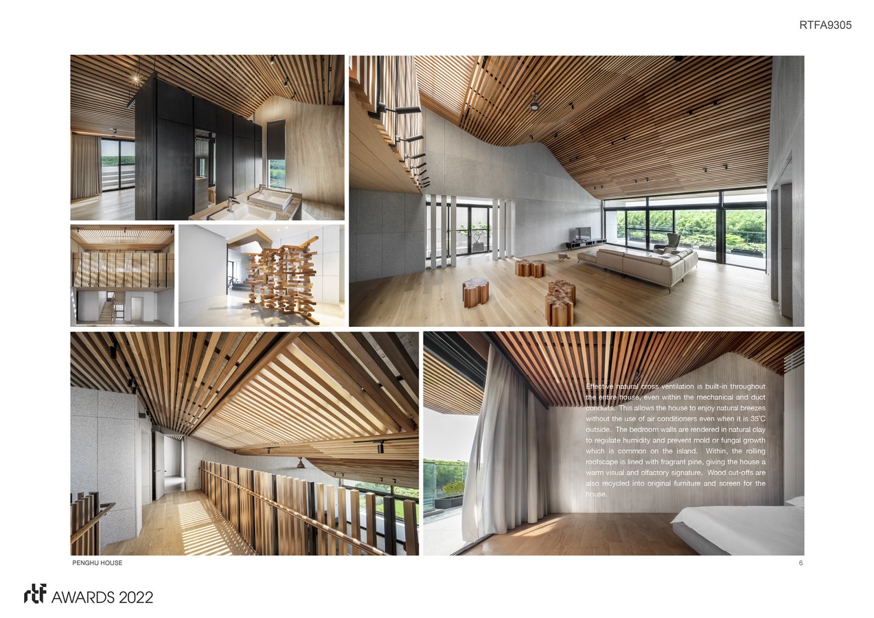 Effective natural cross ventilation is built-in throughout the entire house, even within the mechanical and duct conduits. This allows the house to enjoy natural breezes without the use of air conditioners even when it is 35˚C outside. The bedroom walls are rendered in natural clay to regulate humidity and prevent mold or fungal growth which is common on the island. Within, the rolling roofscape is lined with fragrant pine, giving the house a warm visual and olfactory signature. Wood cut-offs are also recycled into original furniture and screen for the house.