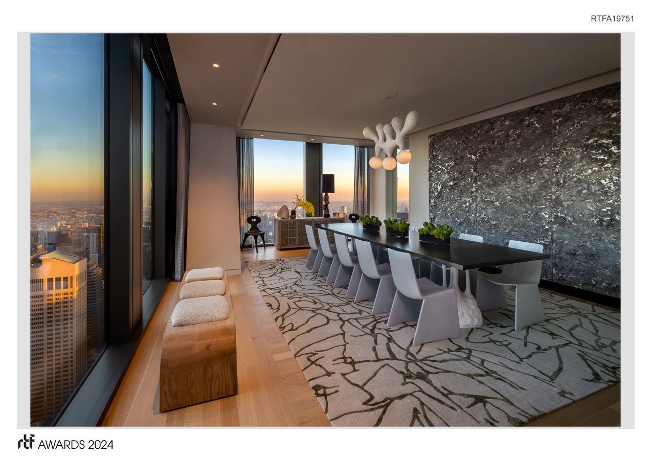 Tasked to create the ultimate NYC penthouse in this 4-bedroom, 3.5-bathroom duplex, the designer drew inspiration from the impressive proportions of the spaces, including the massive ceiling heights, spectacular views from every room, and Thierry Despont’s bespoke finishes. The design team carefully balanced the furnishings, fabrics, rugs, one-of-a-kind artisan pieces, and museum-quality artwork to ensure the various design elements were complementary and harmonious.