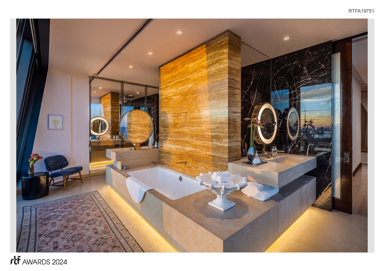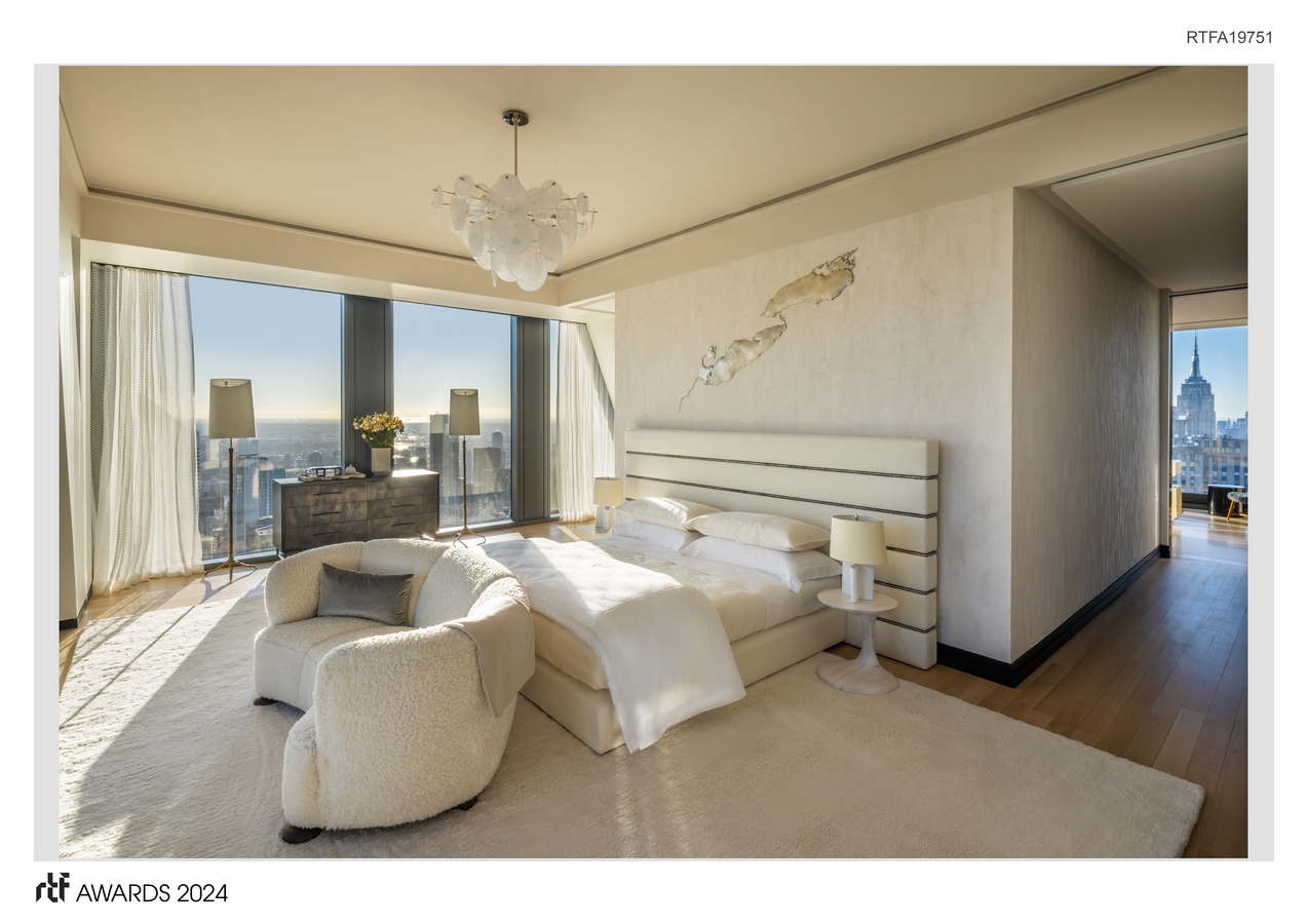 The room is graced with a custom bar by Scavolini, luxurious seating options from Atra, and a discrete office nook adorned with a textural silver-toned wall installation. A beautifully appointed powder room completes this level, with artwork from Pace Gallery and pieces by Joseph Conrad-Ferm carefully placed throughout the hallways. Accessible either via the interior staircase or the private interior elevator, the 77th floor boasts equally impressive design within quieter, more private spaces.