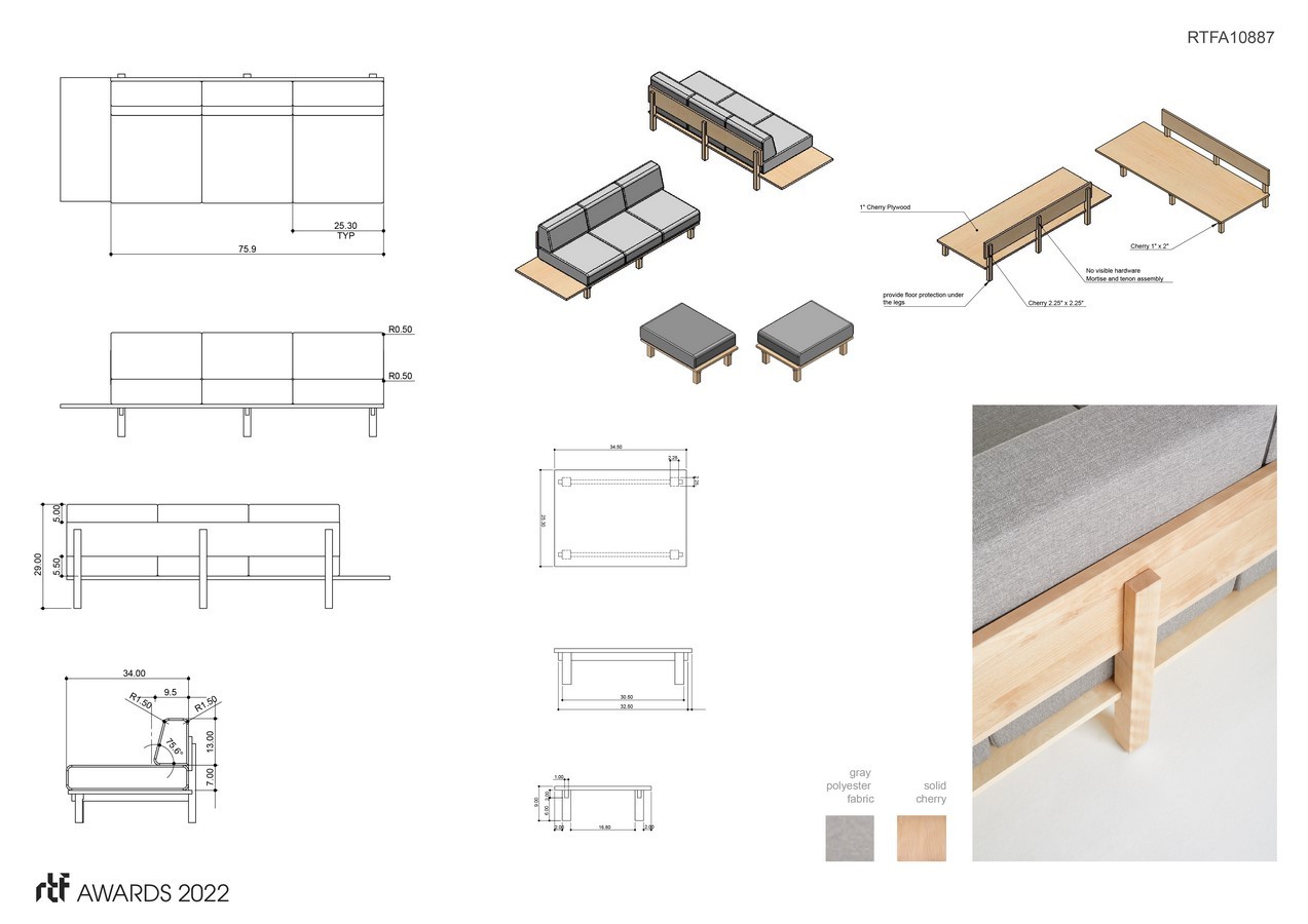 As part of one of our architectural projects, BESIDE Cabins, a development of 75 wilderness cabins in Chertsey, Québec, the client asked us to design a collection of furniture consisting of two sizes of benches and a sofa. The benches are very versatile and can be used in several rooms (entrance bench, bathroom, office, bedside tables or coffee tables). The selection of wood, solid cherry, was made respecting local supply criteria as well as good weather resistance.