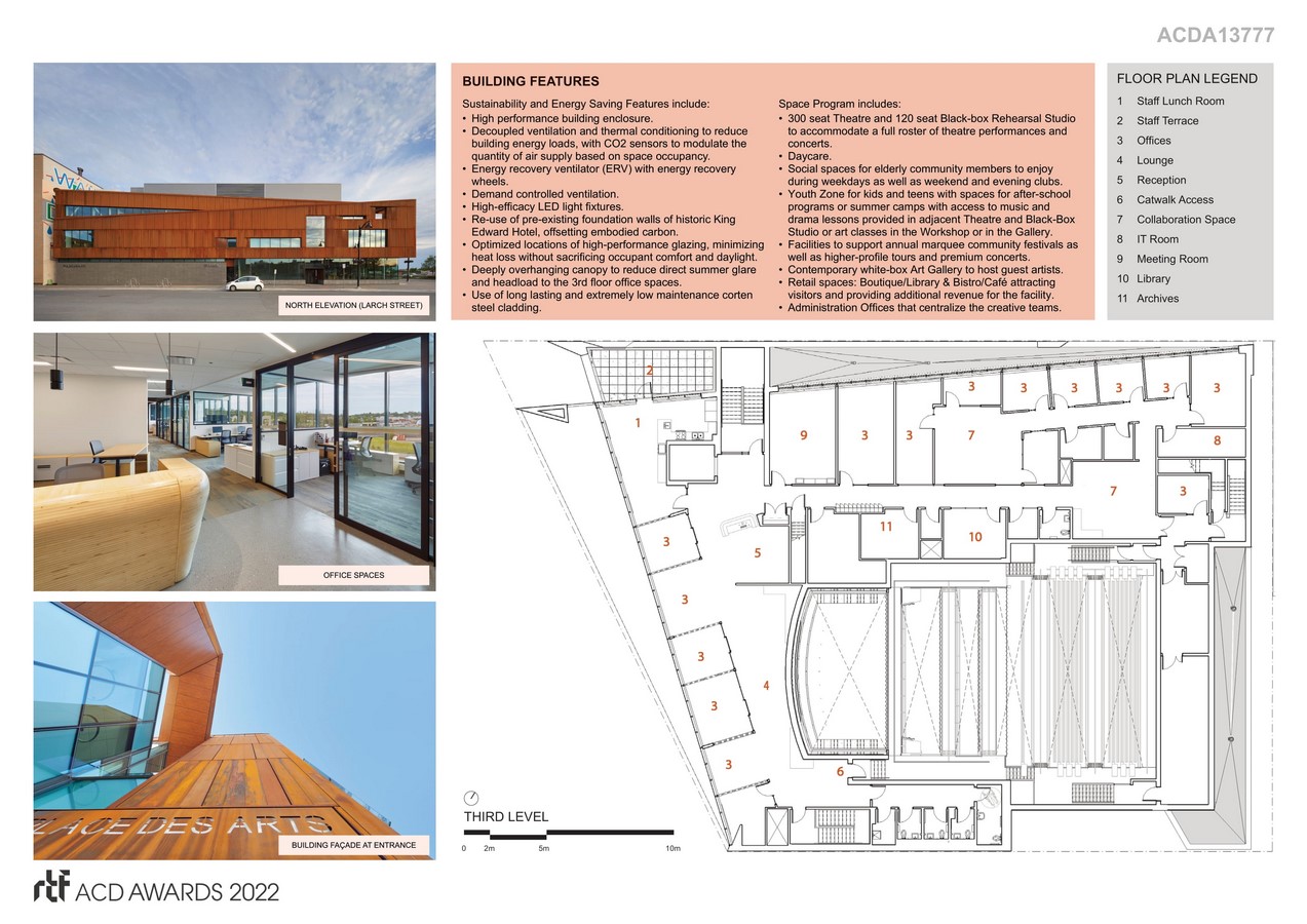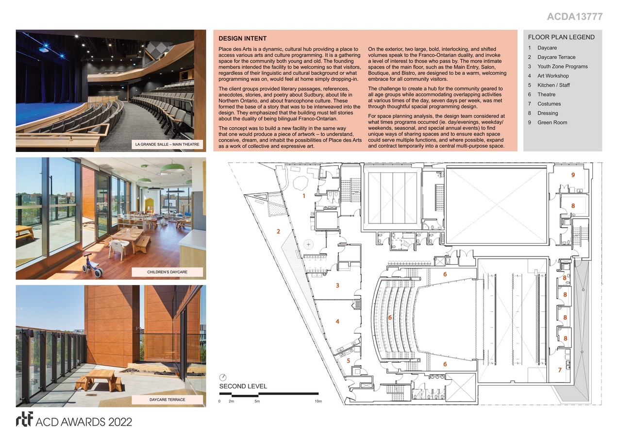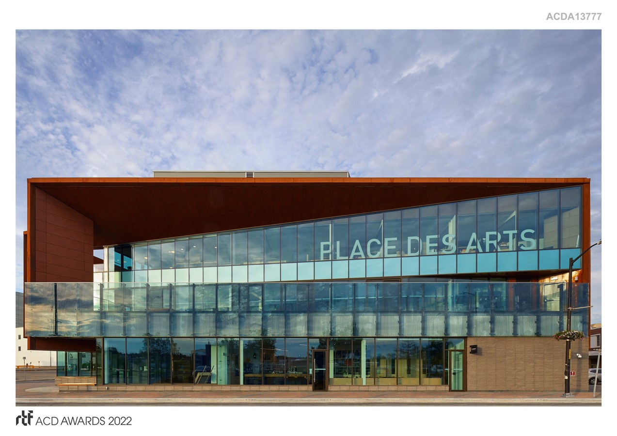 A collaborative endeavour on all fronts, MTA with Bélanger Salach Architects (previously YBSA) jointly served as the lead design architects for this project. Through sound and informed leadership, the two firms were together able to establish consensus amongst the 7 strong voices to achieve a flexible design that provides services for a wide variety of activities and uses, while contributing to the surrounding urban context. The building site is part of a trio of public amenities along the anticipated Elgin Street Greenway and bike path, linking the western and eastern districts of Sudbury. Greater than the sum of its parts, the architectural scheme of Place des Arts is highly intricate. The building program includes a 300-seat theatre, a multi-use studio performance space, a contemporary art gallery, library and national publishing house, boutique, bistro, daycare, and offices.