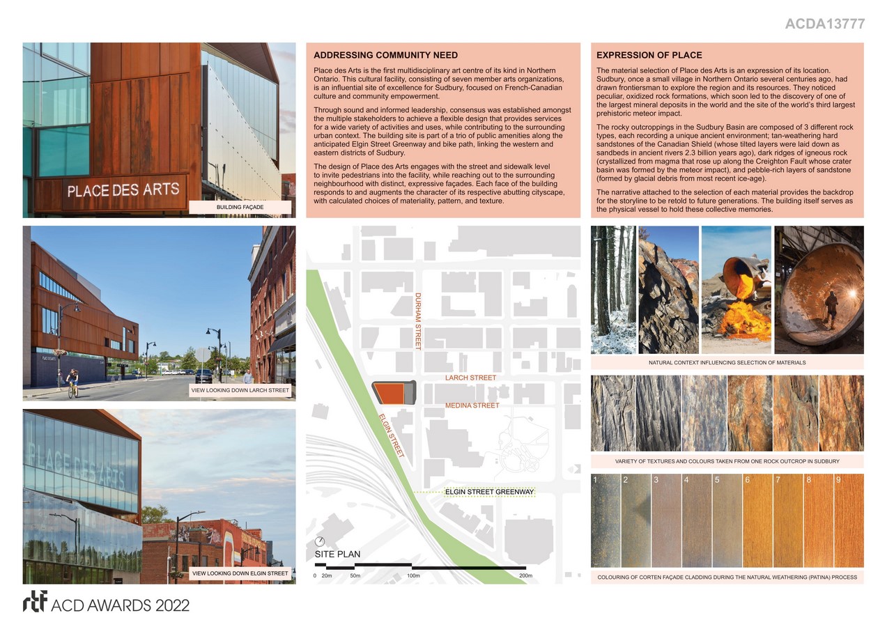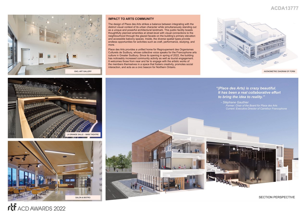 Place des Arts (PdA) is a joint venture project between Toronto-based Moriyama & Teshima Architects (MTA) and Bélanger Salach Architecture (BSA). The first multidisciplinary art centre of its kind in Northern Ontario, this cultural facility – consisting of seven member arts organizations- is projected to be an influential site of excellence for Sudbury focused on French-Canadian culture and community empowerment.