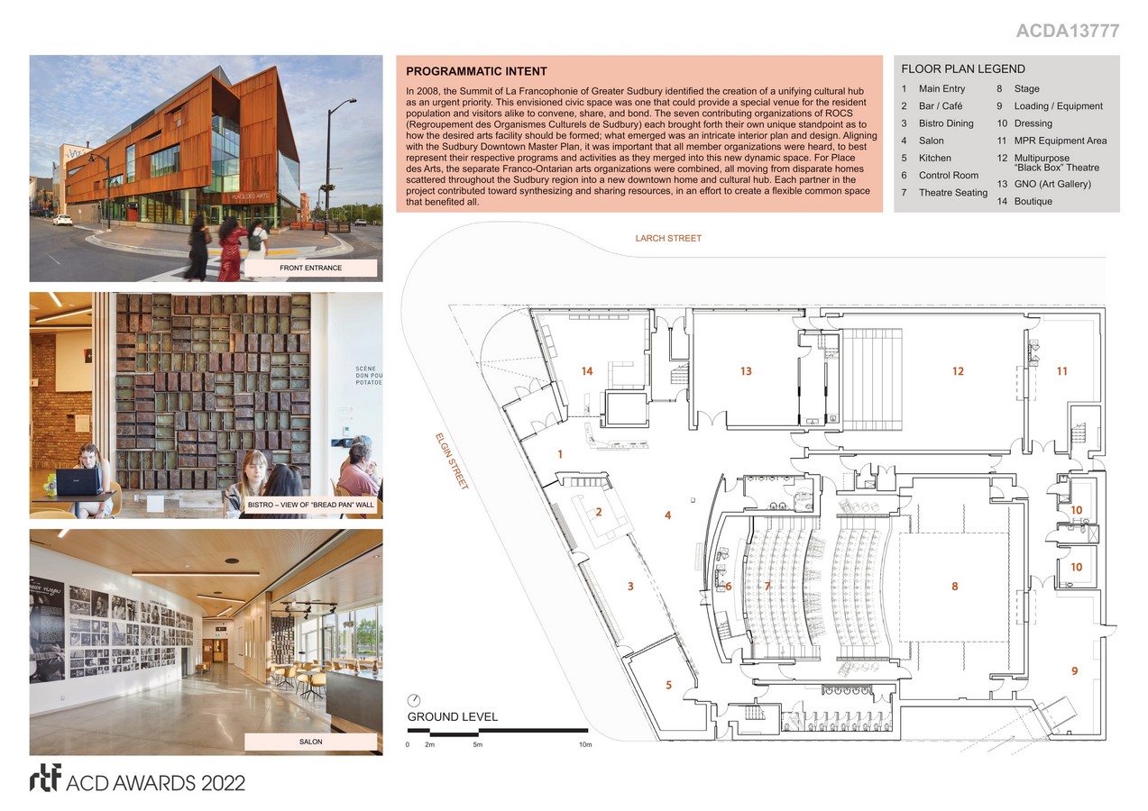 In 2008, the Summit of La Francophonie of Greater Sudbury identified the creation of a unifying cultural hub as an urgent priority. This envisioned civic space was one that could provide a special venue for the resident population and visitors alike to convene, share, and bond. The seven contributing organizations of ROCS (Regroupement des organismes culturels de Sudbury) each brought forth their own unique standpoint as to how the desired arts facility should be formed. Aligning with the Greater Sudbury Downtown Revitalization Masterplan, it was important that all member organizations were heard, to best represent their respective programs and activities as they merged into this new dynamic space.