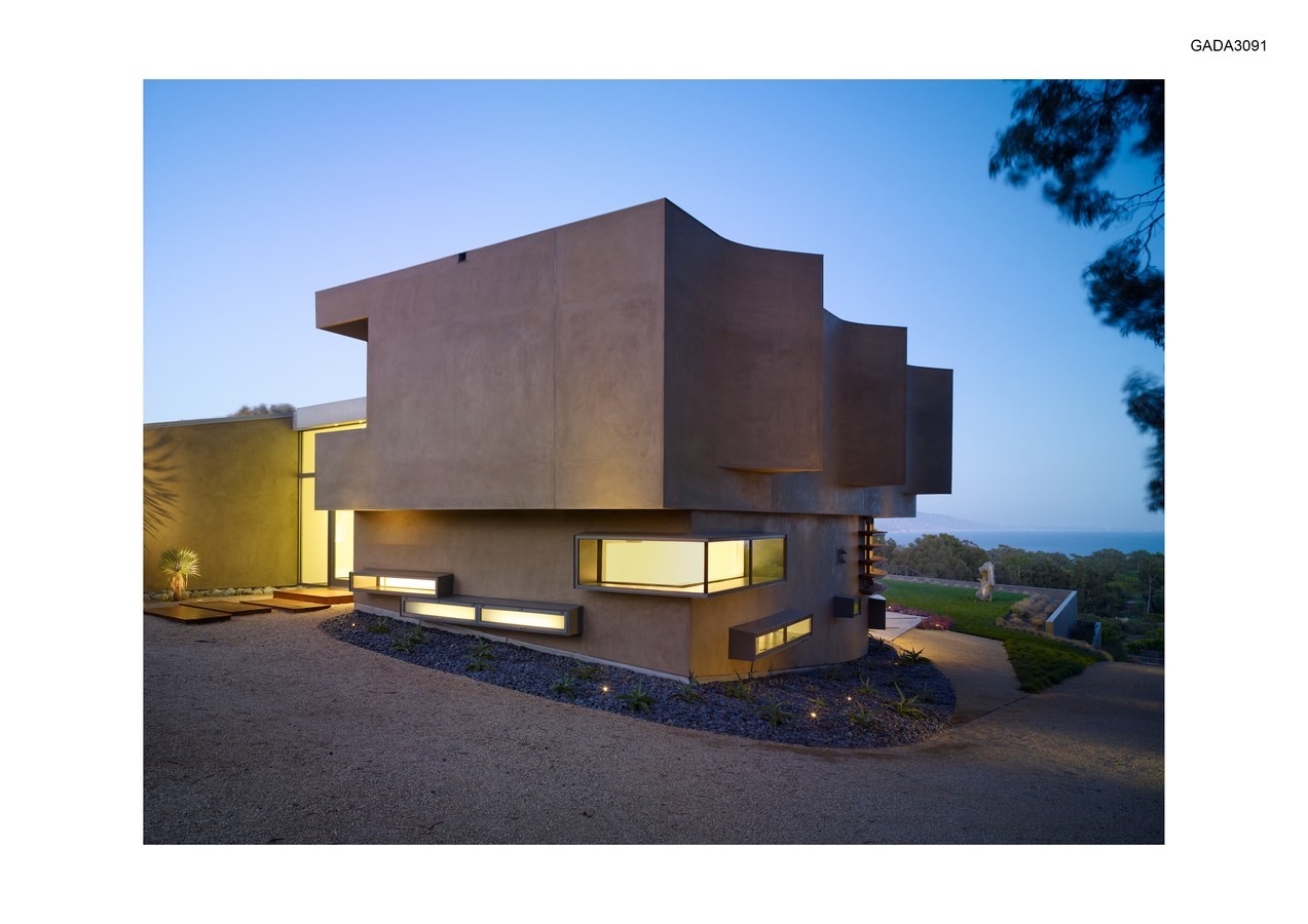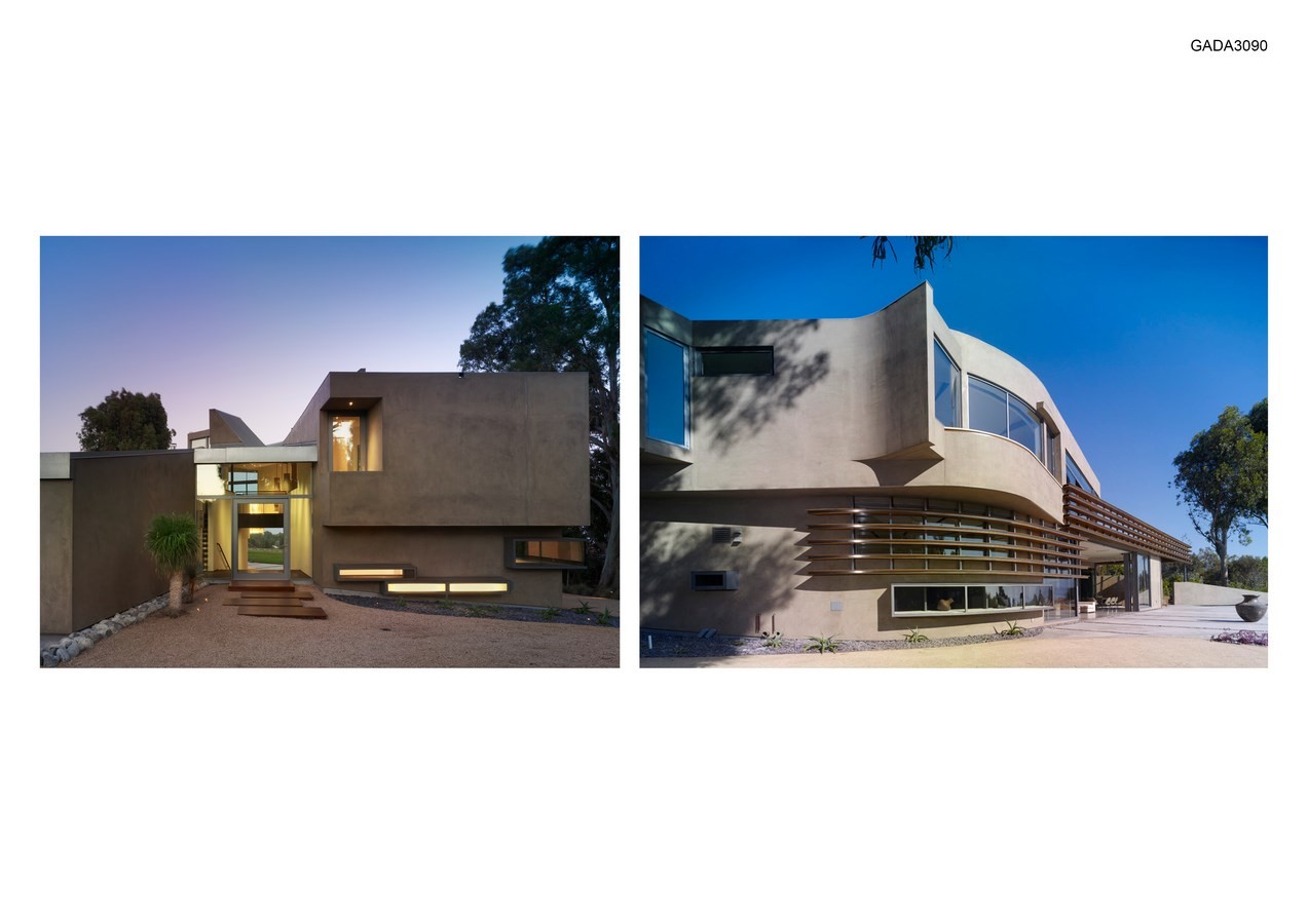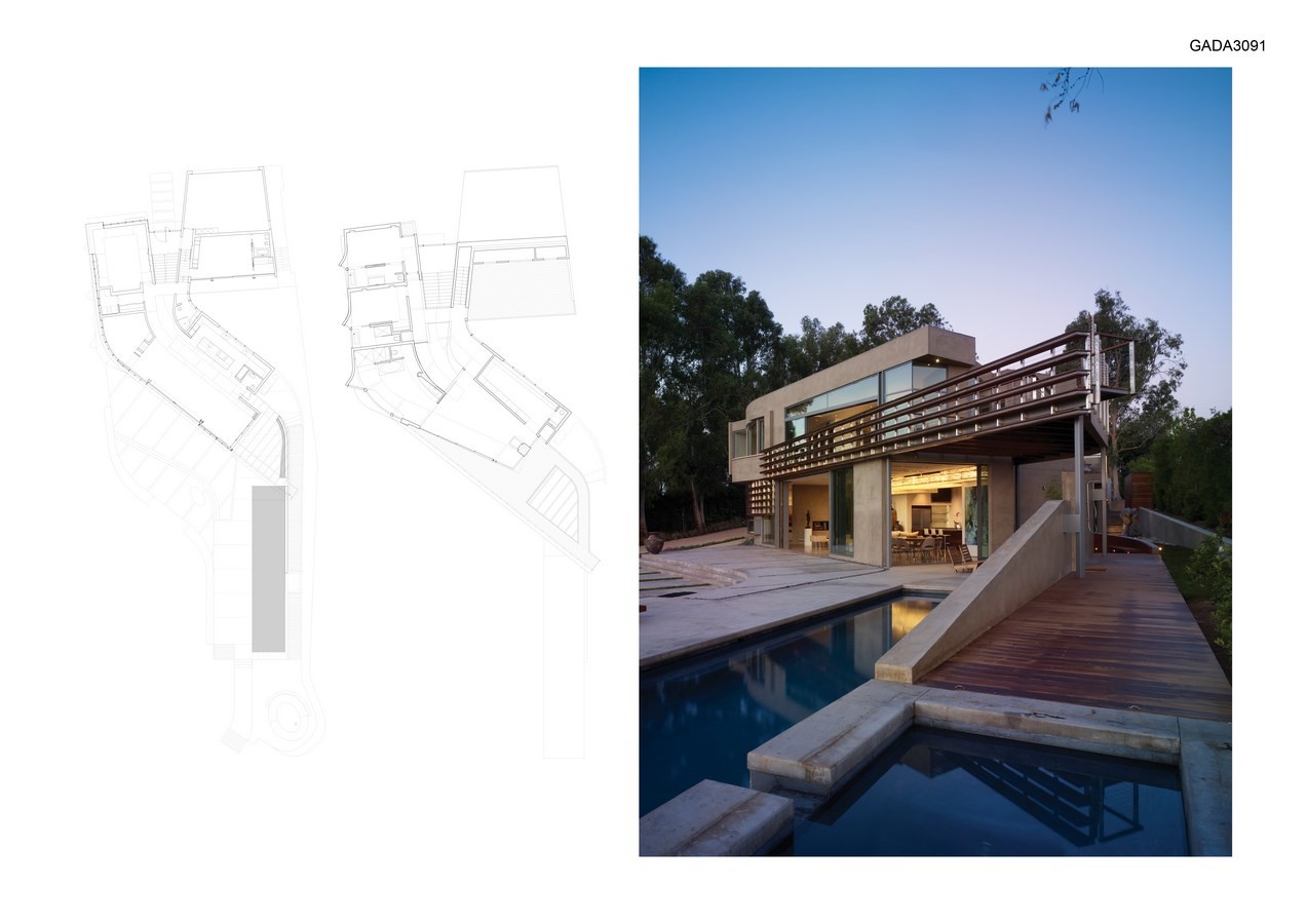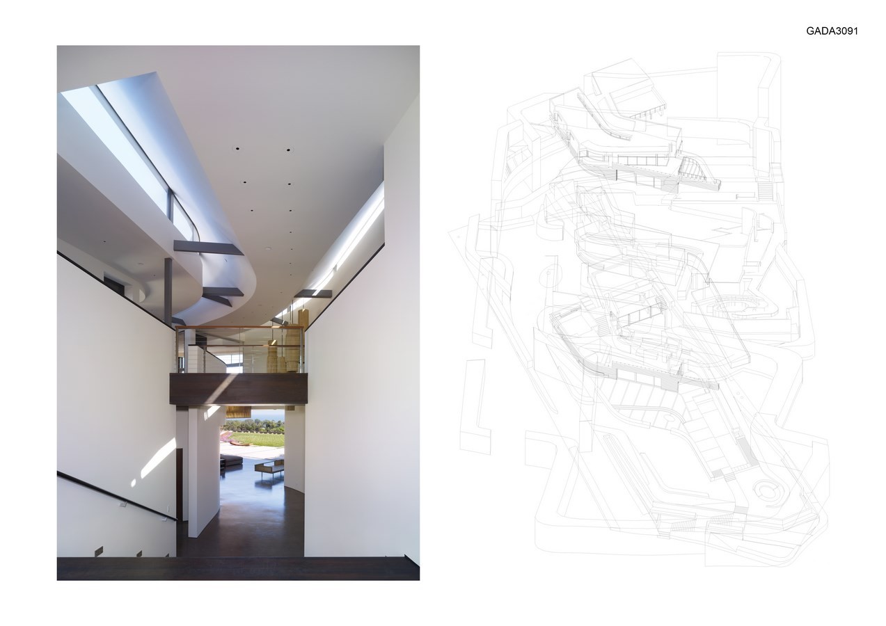 Sinuous surfaces delineate volumes that are differentiated by slicing surfaces and materials, with spatial intersections that break down edges between inside and outside, engaging the land with the internal logics of the house.