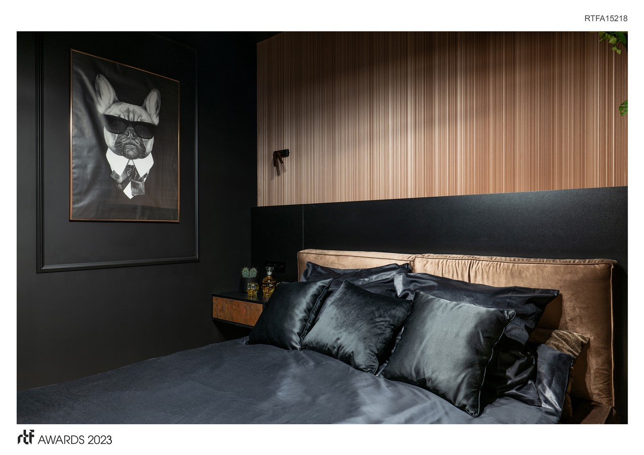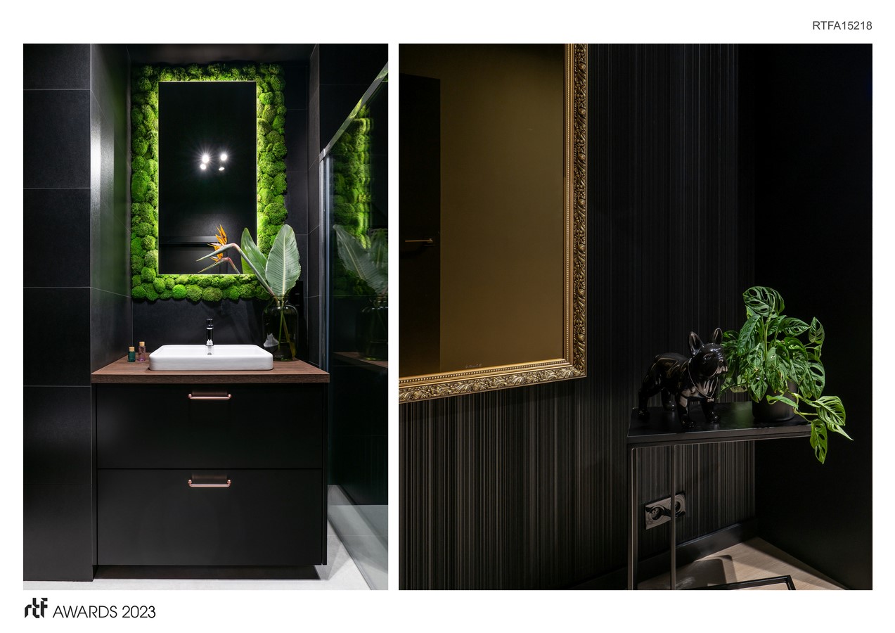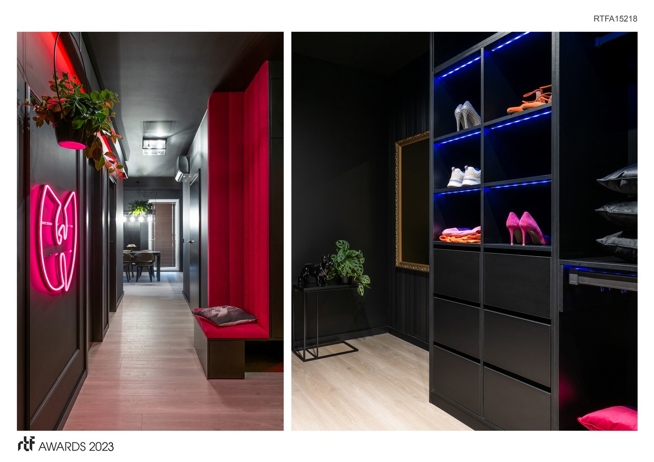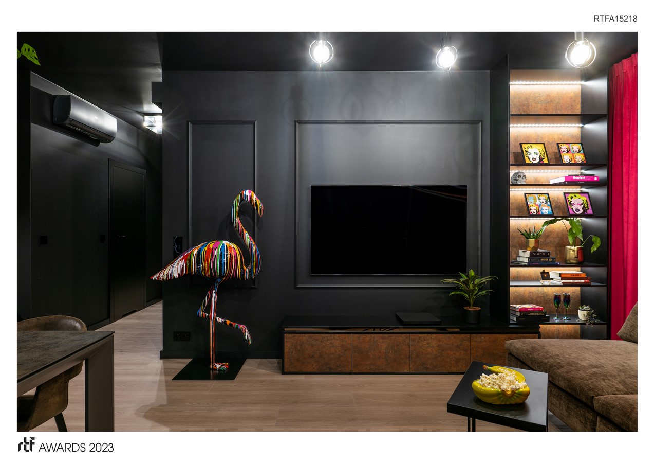 In addition to its complex usability, the flat has plenty interesting decorative solutions that look particularly attractive against the black walls and the deep brown of the furniture. Each room has its colourful theme—the bathroom is dominated by a mirror with a luscious green reindeer moss frame; the wardrobe is distinguished by an illuminated wardrobe with the option of changing the colour; and the living room and the corridor have neon graphics and LED ceilings lamps, an original flamingo sculpture, and an intense red window curtain.