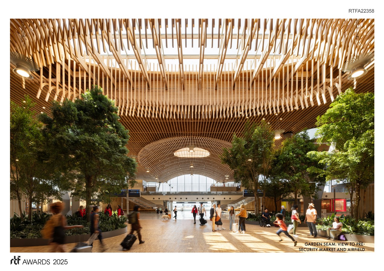 Taking cues from Portland’s unique short city blocks, parks, and pedestrian-friendly streets, the design team reimagined Portland’s urban fabric inside the terminal as a “series of rooms” under one timber roof. The smaller-scale architecture reinforces a walkable neighborhood-like feel and invites travelers to linger by locating seating options along terrazzo, wood, and carpet circulation paths lined with trees and planters.