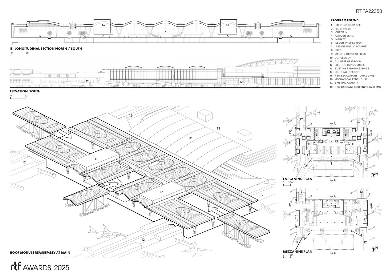 PDX is the first major U.S. airport with a mass timber roof. The project team chose mass timber for several reasons, including cost-effectiveness, constructability, sustainability, and celebrating Oregon’s innovative timber industry. The terminal’s new lighting strategy maximizes daylight harvesting by featuring 49 skylights that illuminate 60% of the terminal with daylight filtered through the timber overstory and is supplemented by custom hanging light fixtures. The mass timber roof is made from 3.5 million board feet of wood, utilizing three different wood products: mass plywood panels for the roof diaphragm, glulam beams, and 3×6 timbers for the lattice. The terminal’s seismic resiliency is enhanced by connecting the 18-million-lb, 400,000-sq-ft roof to 34 Y-shaped columns via seismic isolators on top. The wood-sourcing strategy supported local economies and promoted forestry practices that protect Oregon’s natural resources.