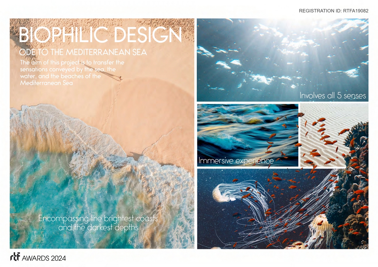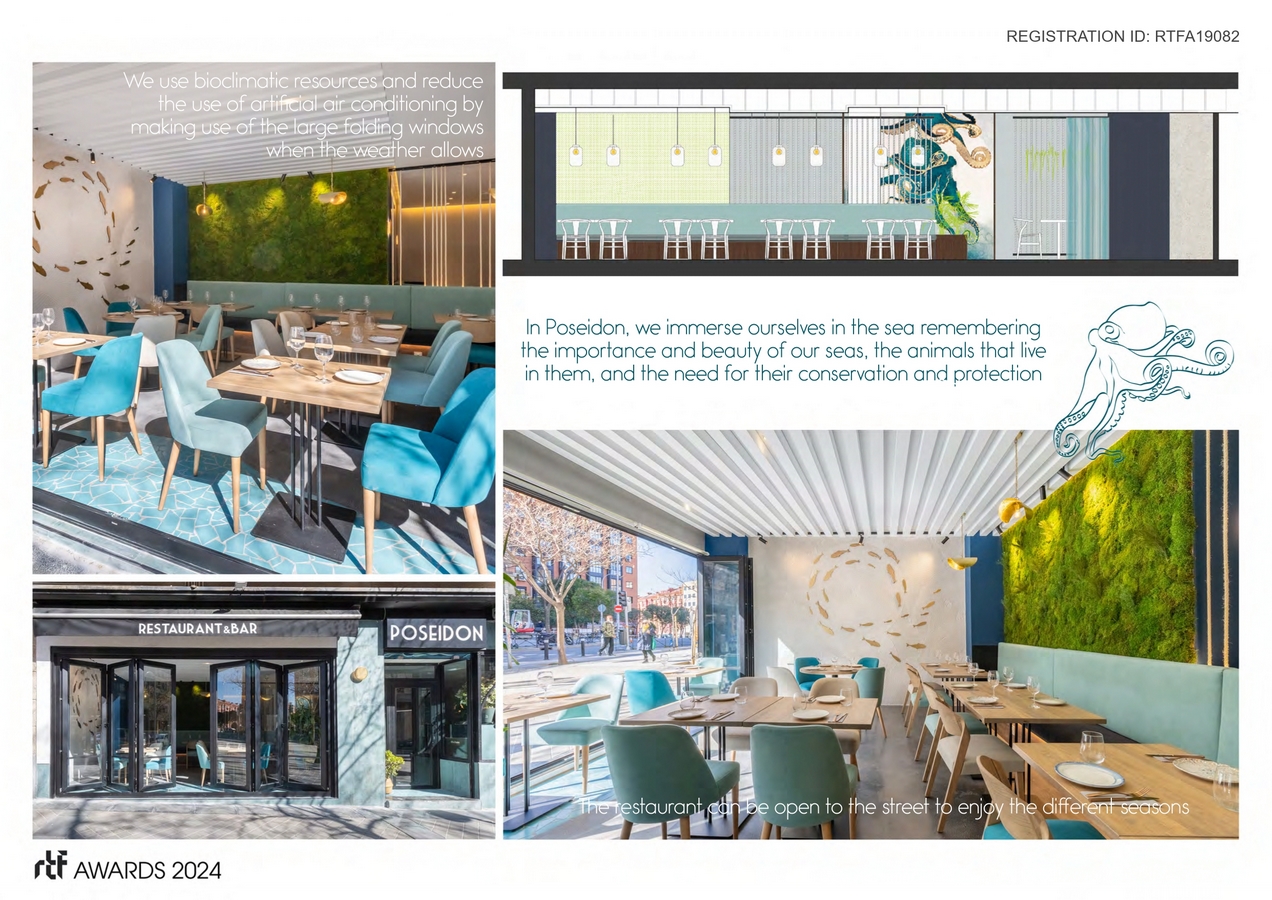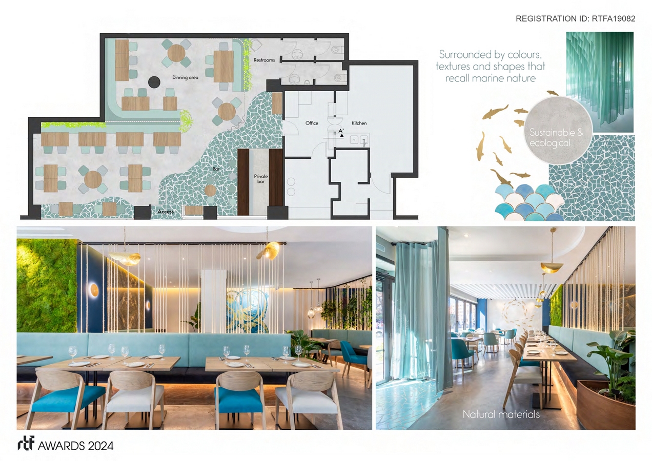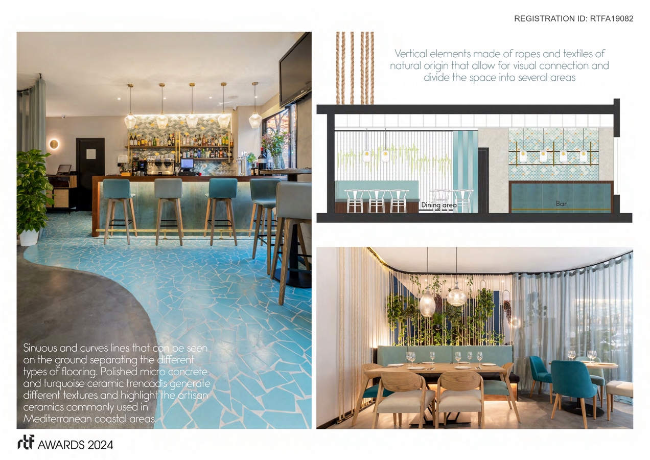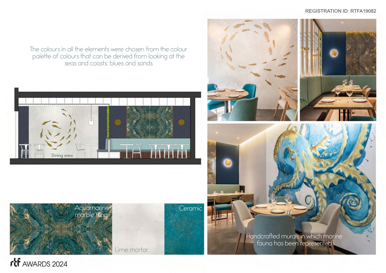 With this design, we seek to create an immersive experience in the sea, encompassing the brightest coasts and the darkest depths so people may eat surrounded by colours, textures and shapes that recall marine nature and, especially, the Mediterranean culture.